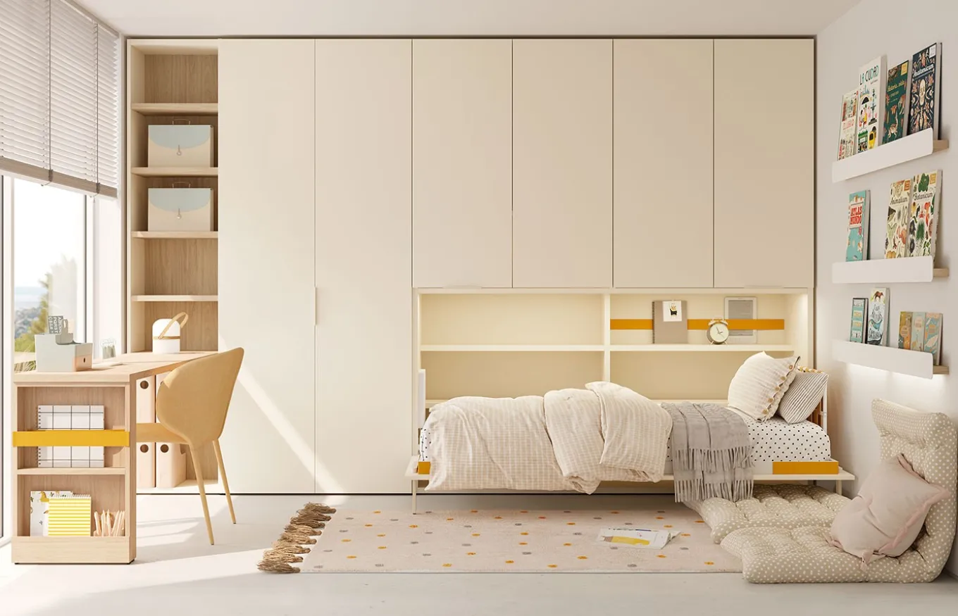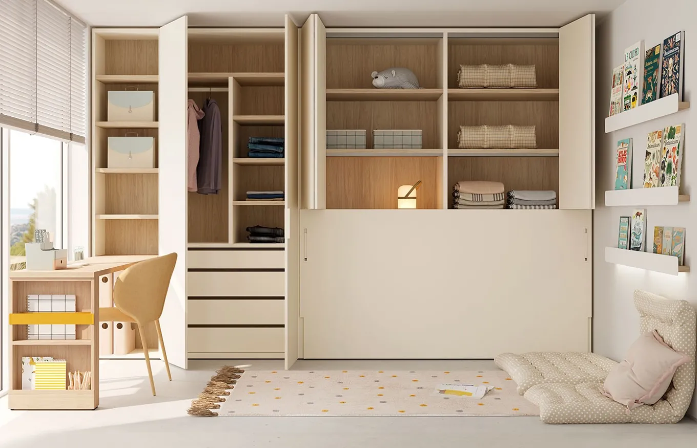 Transforma tu habitación juvenil en un espacio dinámico y funcional con la versatilidad de Jotajotape. Imagina un armario integrado con una cama plegable que se oculta a la vista, liberando espacio durante el día para estudiar, jugar o relajarte. Las soluciones de Jotajotape te permiten optimizar cada centímetro, creando un ambiente personalizado y ordenado. Con una amplia variedad de diseños y acabados, podrás adaptar tu habitación a tu estilo único, combinando funcionalidad y estética en perfecta armonía.
