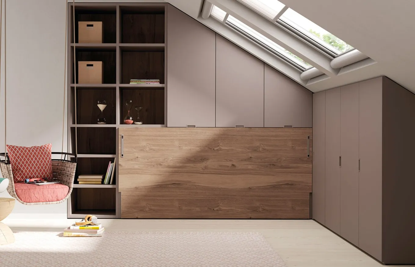 Puedes combinar la cama Up&Down con el programa de armarios No Limits+ de Jotajotape. Un sistema de almacenaje que salva cualquier obstáculo arquitectónico.