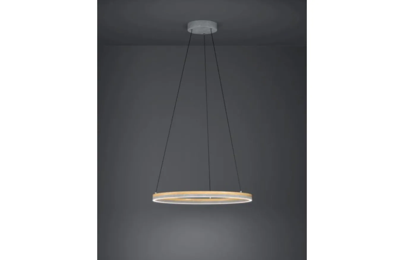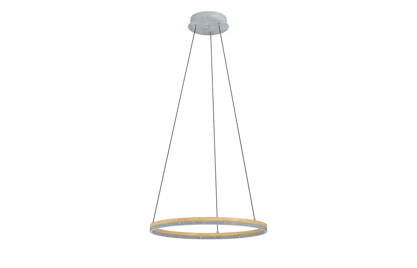 La lámpara colgante Cadinaro está fabricada con un aro luminoso de chapa de roble y metal con aspecto de cemento. El anillo está suspendido de un dosel de metal redondo de color cemento con tres cuerdas en color negro. Los LED integrados debajo de la cubierta de plástico blanca emiten una agradable luz blanca cálida y se pueden atenuar con un regulador.