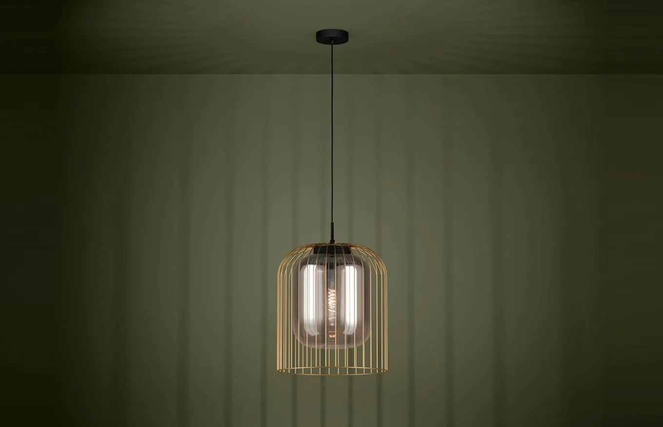 La lámpara colgante Caminata está fabricada con una pantalla interna de vidrio ahumado en color negro transparente (fumé) rodeada por una cesta de alambre fino en color oro mate. La suspensión de metal negro y el cable textil del mismo color completan a la perfección el aspecto elegante de Caminata.