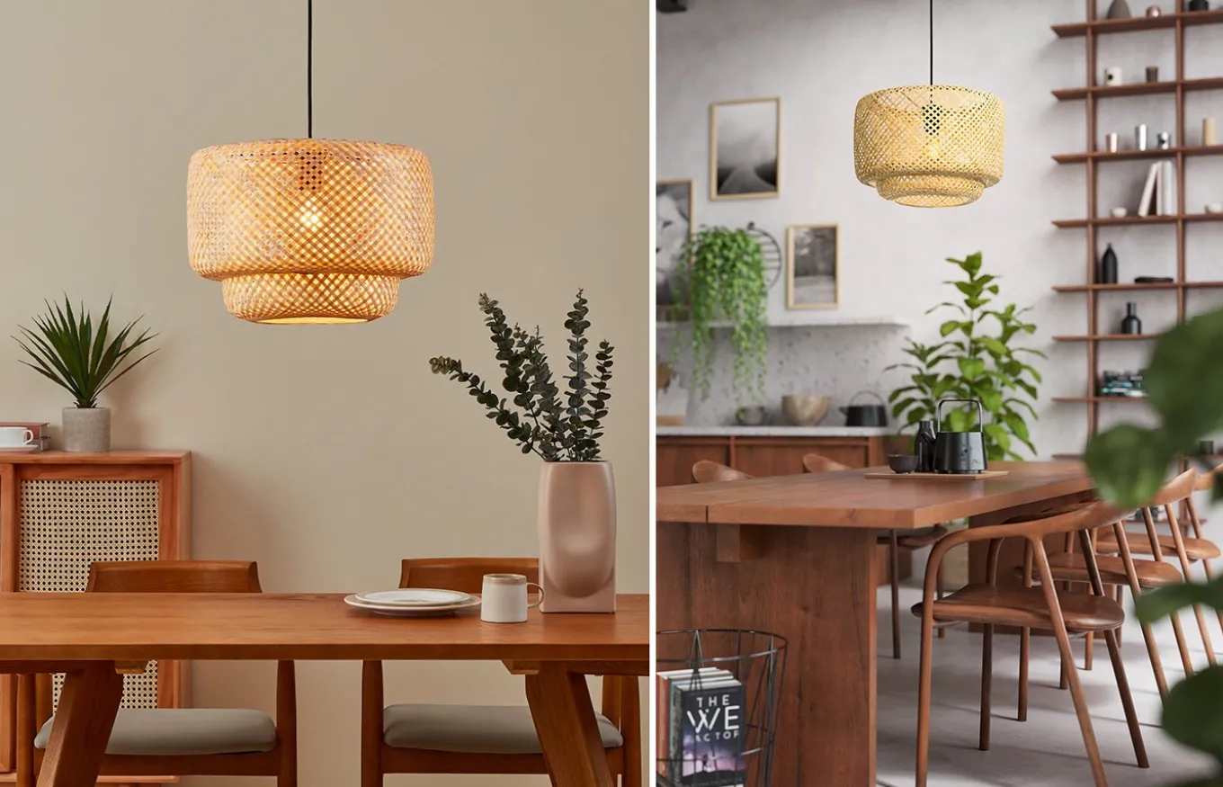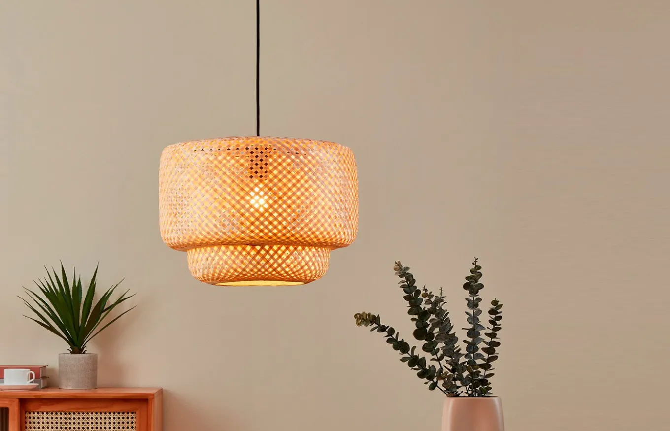 La Luminaria colgante Hettonle está compuesta por una suspensión de metal negro con una pantalla redonda en dos niveles de tejido de ratán de color natural y un cable textil negro. La pantalla trenzada proporciona una iluminación especial y crea un atractivo juego de luces y sombras en el techo y la pared. Esta lámpara colgante se adapta bien a los estilos de decoración Nature y Boho.