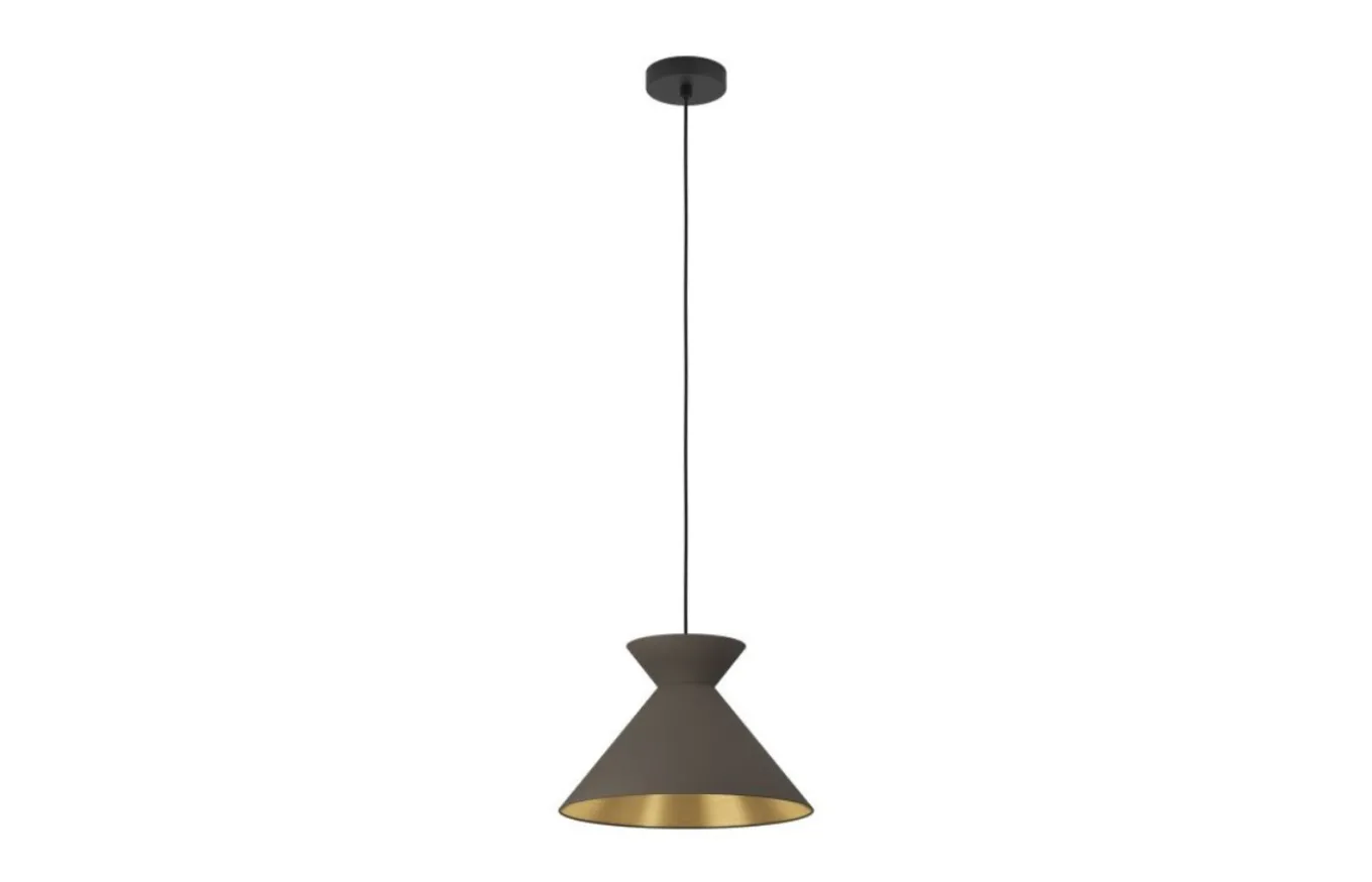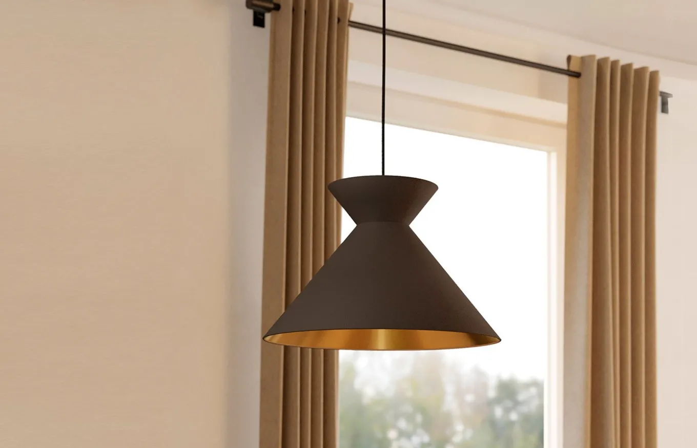 La lámpara colgante Nastasia está formada por una pantalla de metal en forma de reloj de arena en color capuchino y con interior dorado. La lámpara se combina con una suspensión de metal cepillado latón y un cable textil negro. Esta lámpara encaja bien en el salón o sobre la mesa del comedor.