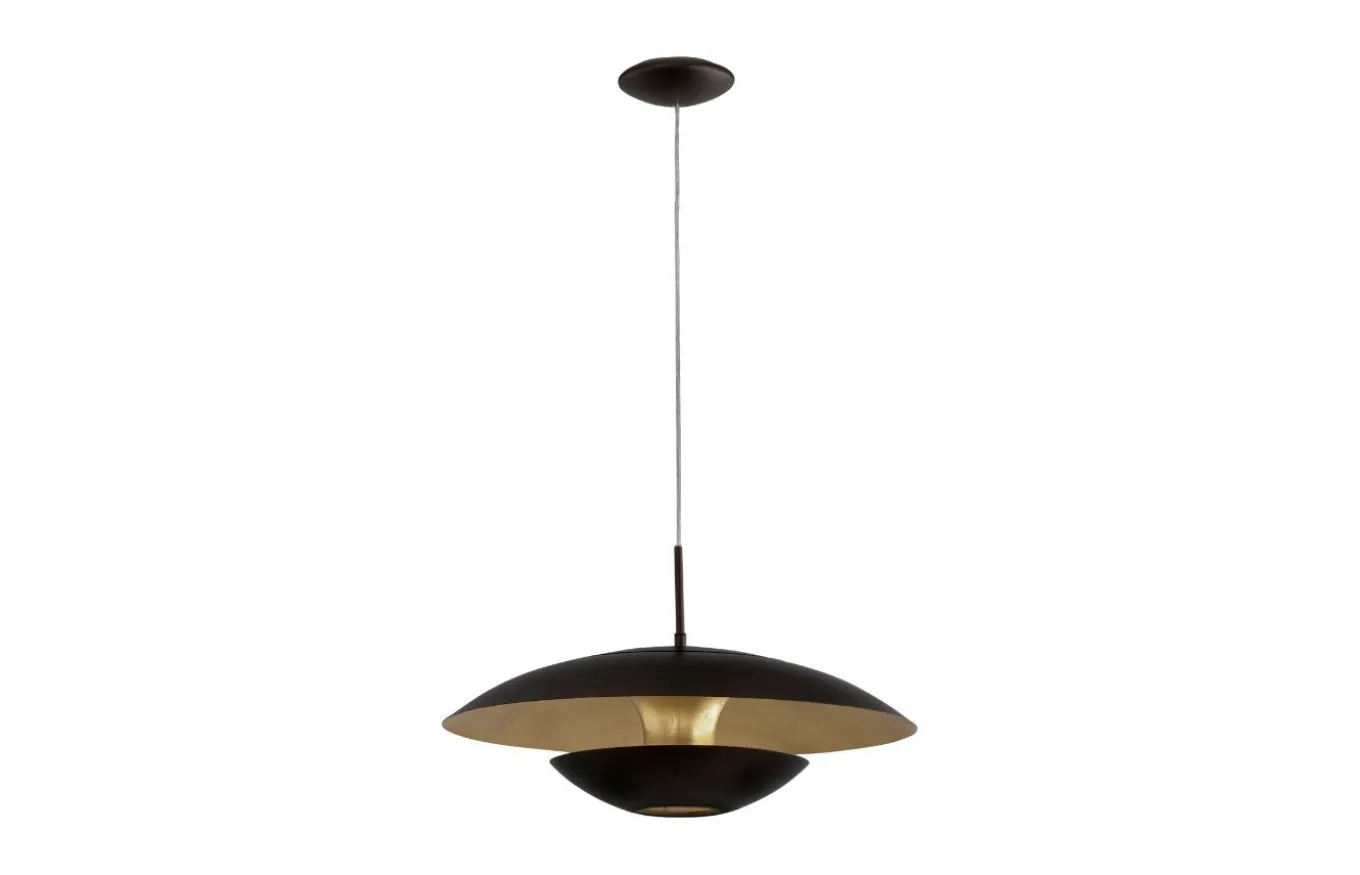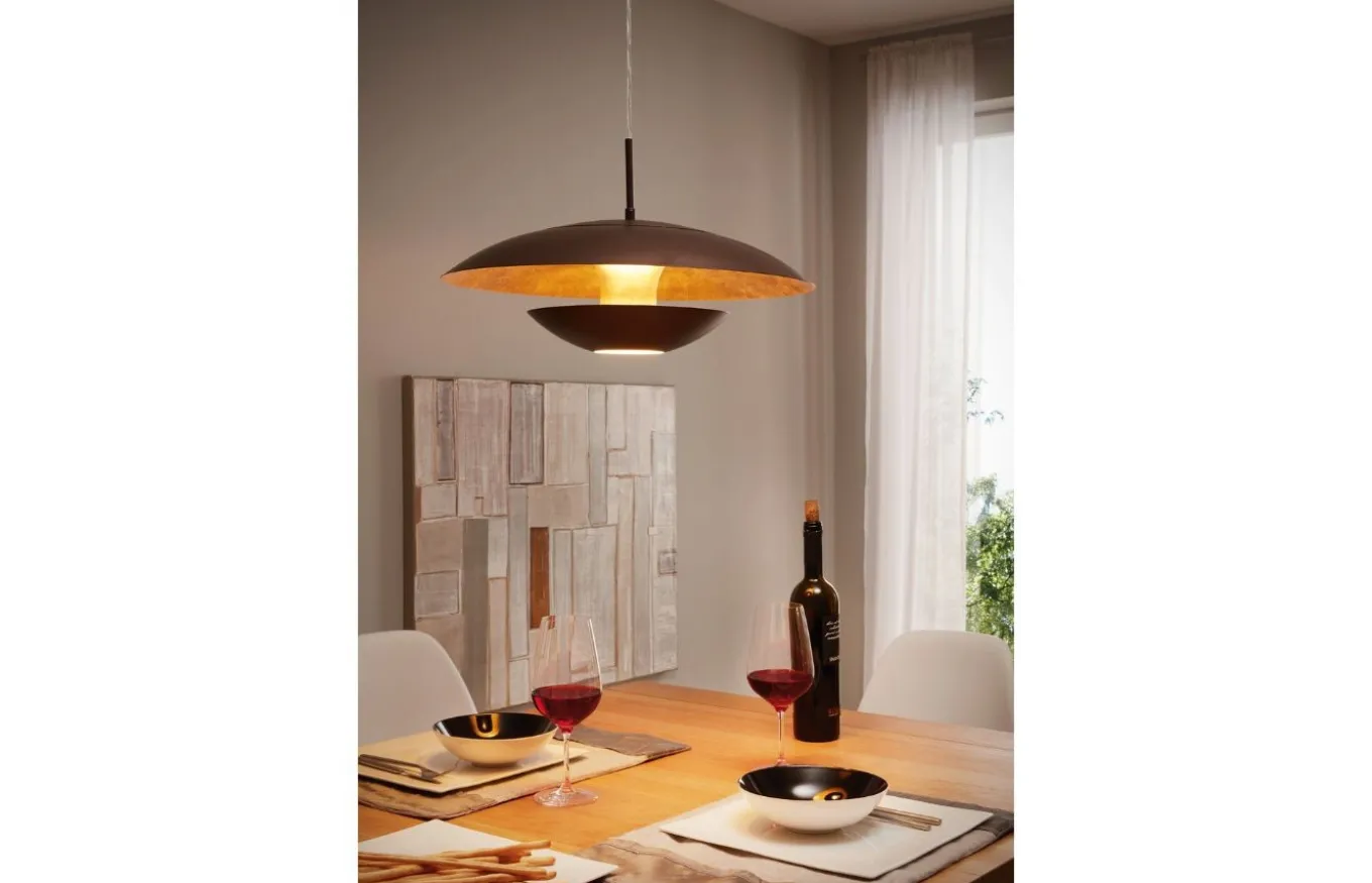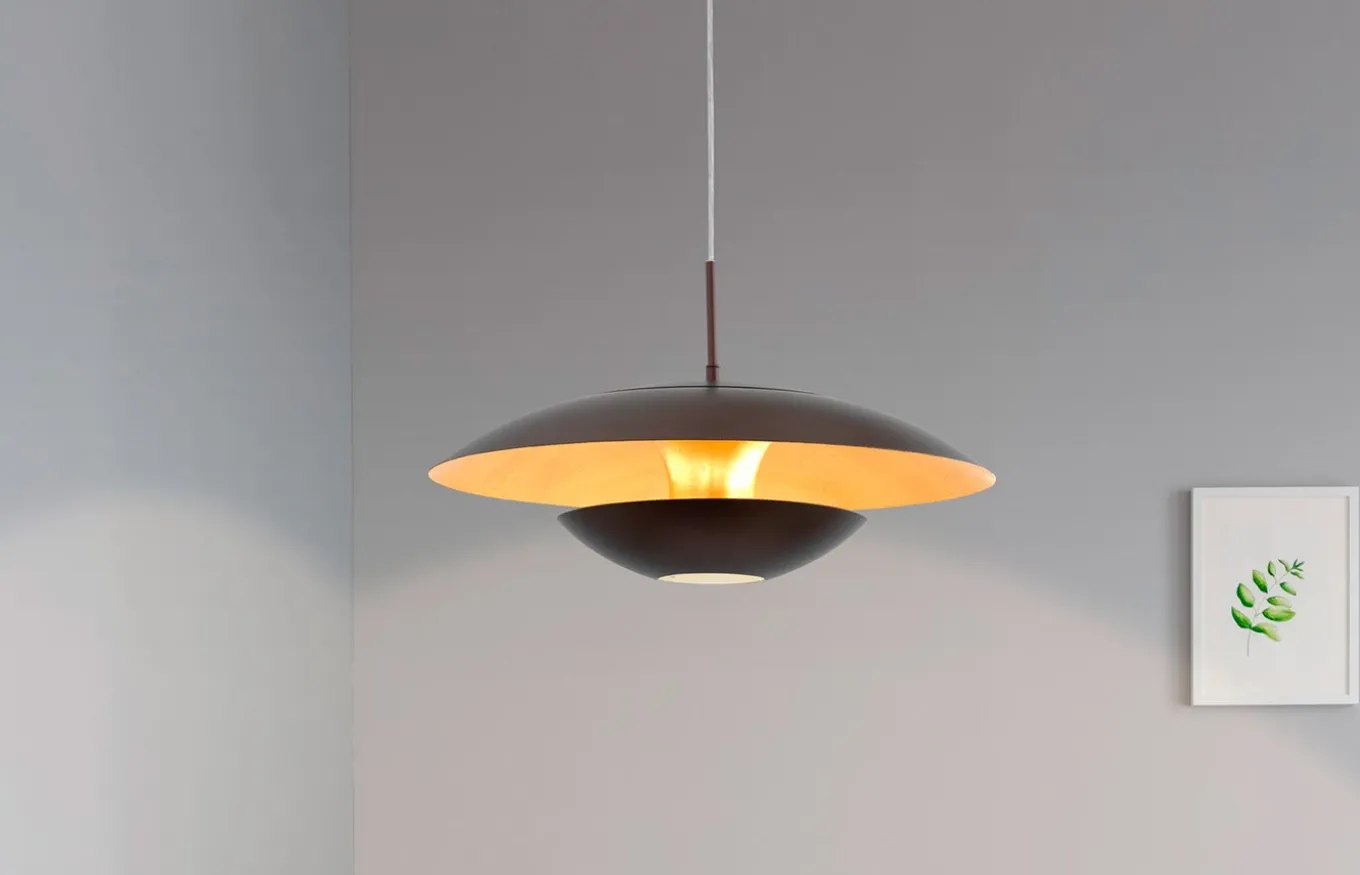 La lámpara colgante Nuvano está fabricada con una pantalla de forma orgánica de metal negro con un interior dorado y un acabado efecto metal. Gracias al diseño especial, se crea una iluminación indirecta adicional dentro de la pantalla, lo que completa de manera óptima el aspecto exclusivo de la lámpara.