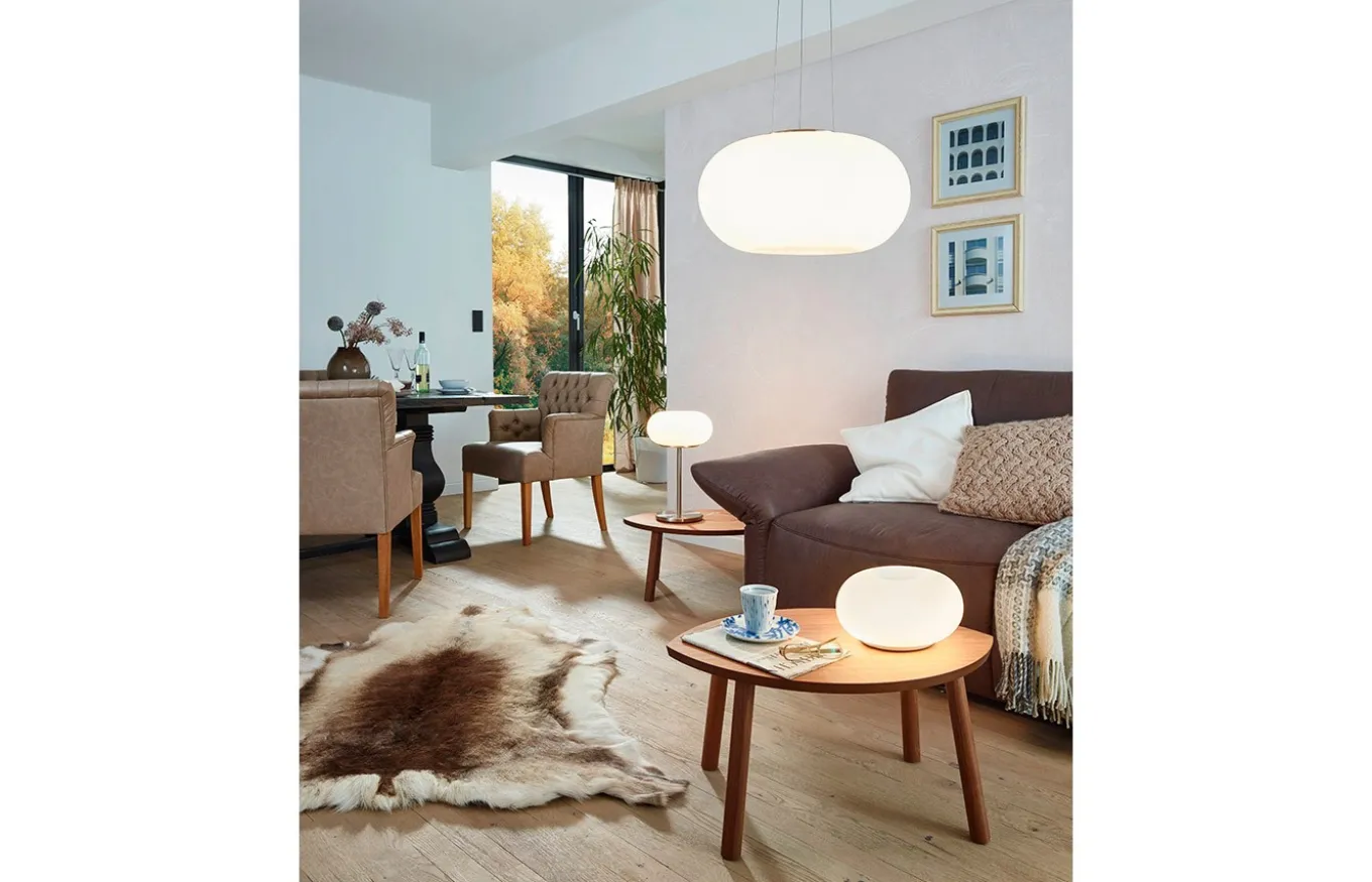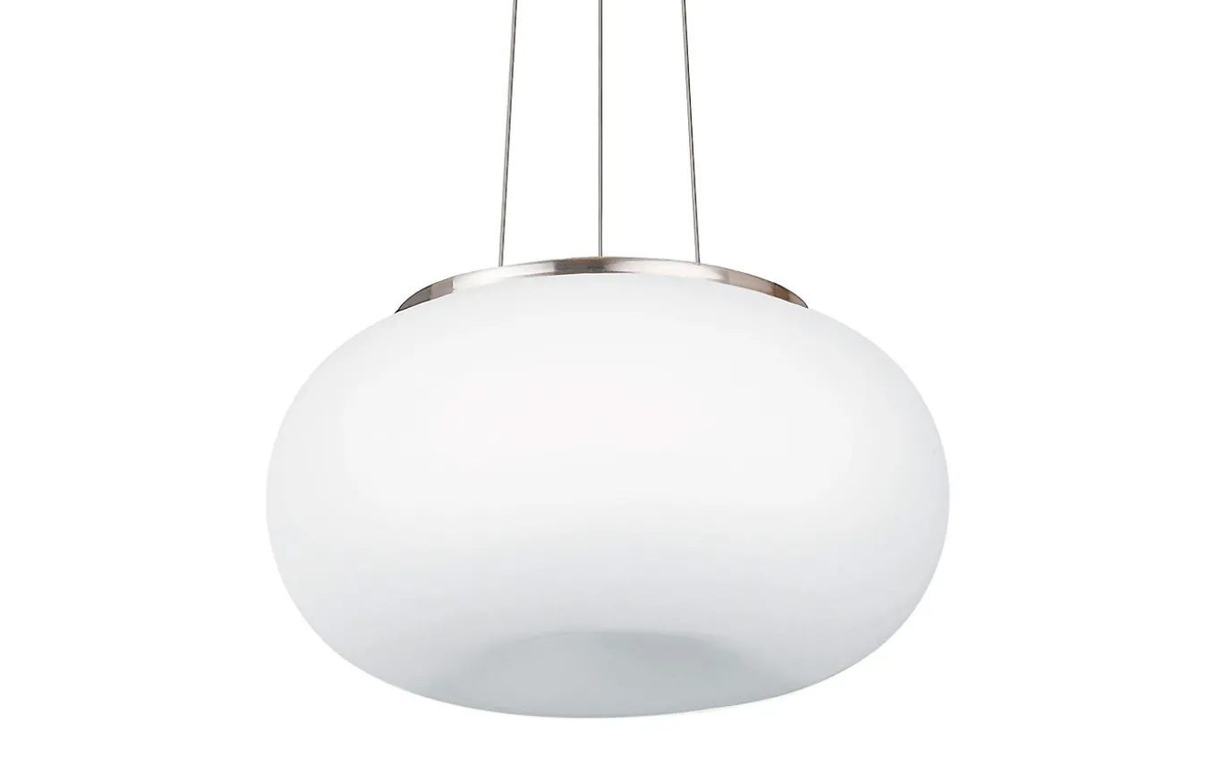 La luminaria colgante Optica está fabricada por una pantalla redonda de cristal opal de formas orgánicas en color blanco, un dosel níquel mate y tres cables metálicos del mismo color. La lámpara colgante se integra a la perfección en ambientes modernos y proporciona una iluminación elegante en el salón o el comedor.