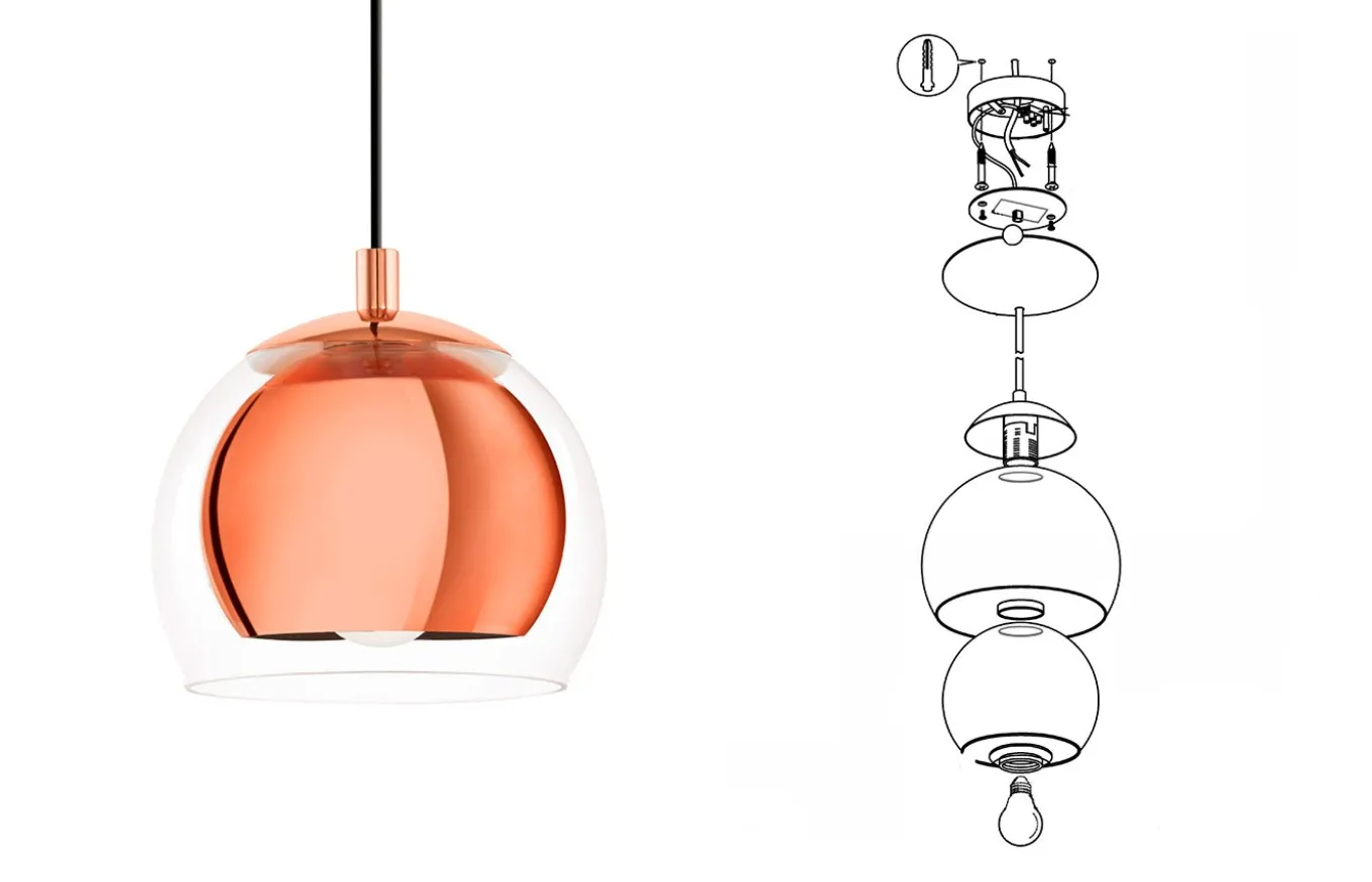 La lámpara colgante Rocamar está fabricada con una pantalla esférica de cristal transparente, que se combina con una pantalla interior de metal en color cobre. La pantalla está suspendida de un dosel redondo de metal color cobre.