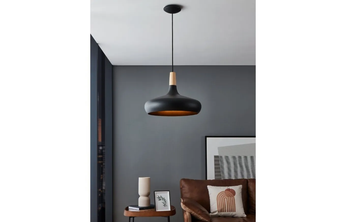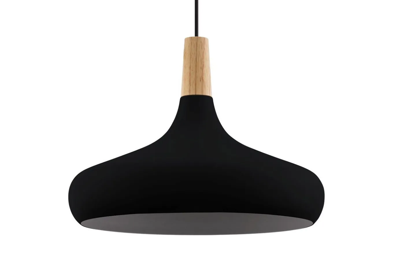 La luminaria colgante Sabinar tiene una pantalla de metal de forma orgánica en color negro y está suspendida de un cable negro. La pantalla se combina con un elemento adosado de madera, que completa el encanto especial de la lámpara.
