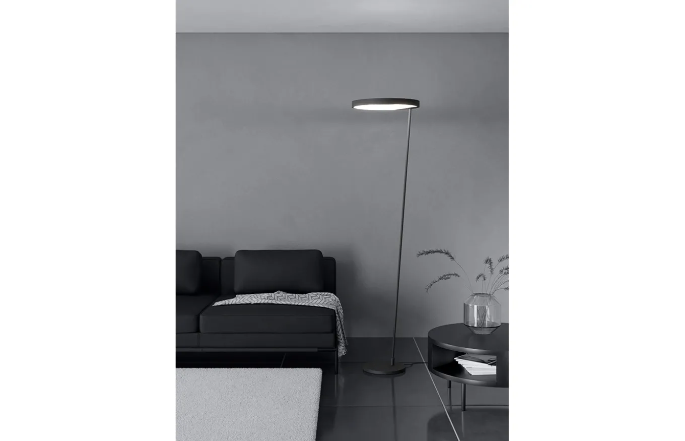 La lámpara de pie Caredara está fabricada con una pantalla de cristal ahumado de forma orgánica en color negro transparente (fumé). La pantalla está suspendida mediante un cable textil negro de un dosel de metal cromado.