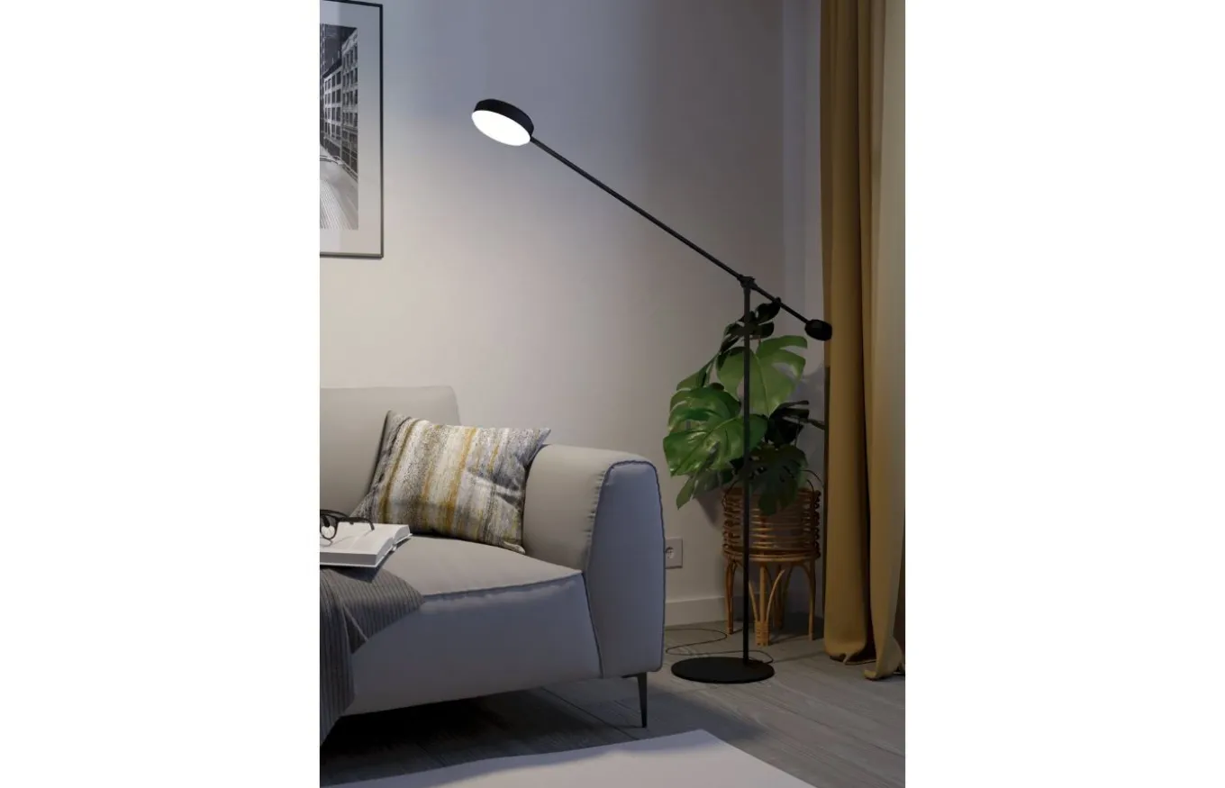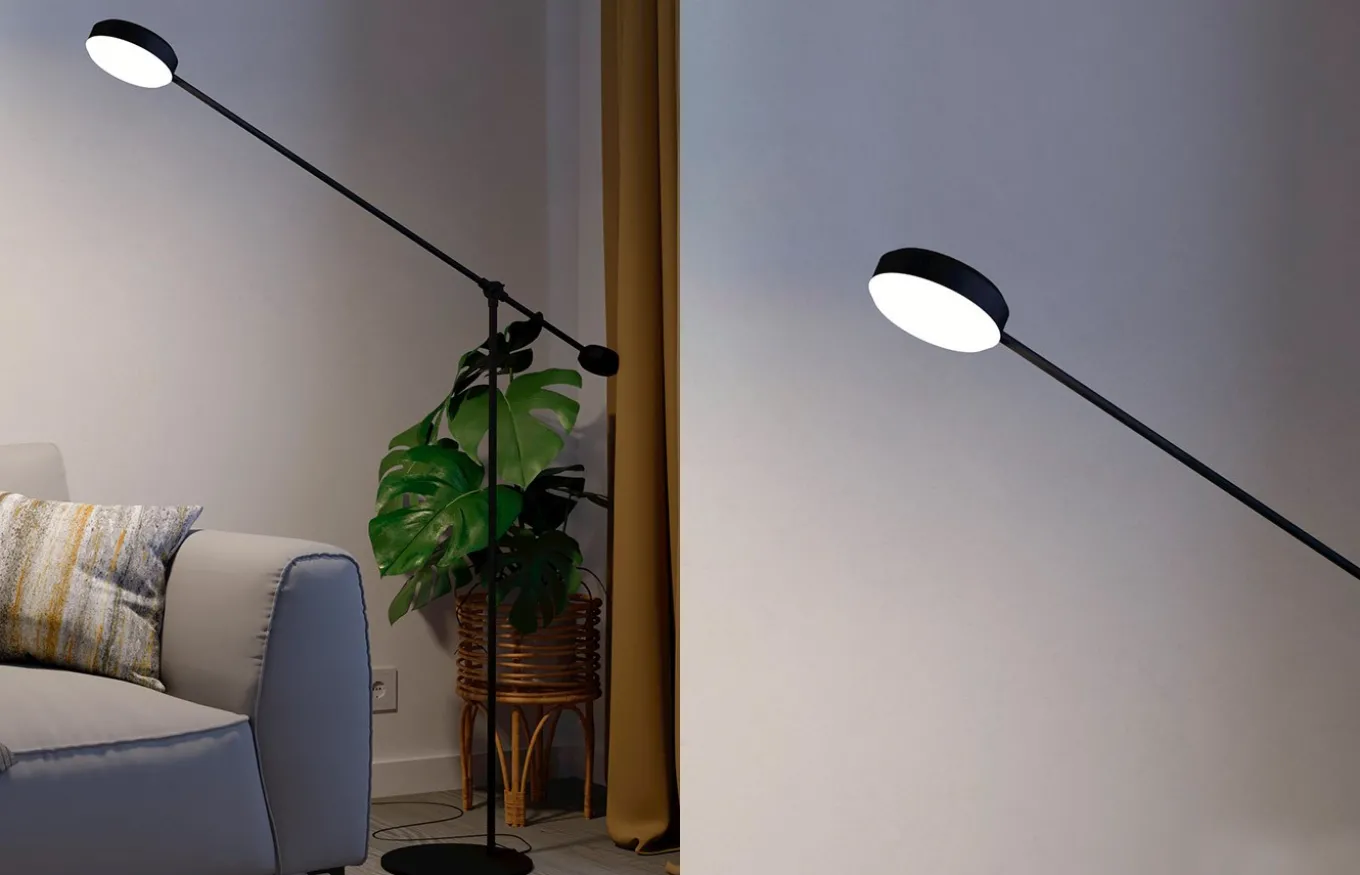 Lámpara de pie Clavellina está compuesta por una pantalla circular fabricada en acero de color negro y una pantalla de plástico en color blanco que proyecta luz LED con intensidad regulable para adecuarla al momento.