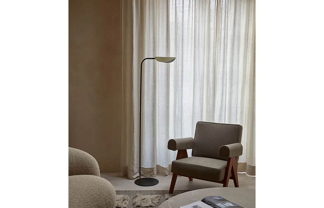 La lámpara de pie Ficus, diseñada por JF Sevilla en 2017, tiene un diseño minimalista que combina una pantalla de acero con acabado oro mate, con el cuerpo y la base también en acero con acabado en negro mate. Es ideal para utilizarla en el salón como iluminación ambiente o luz de lectura junto a un sillón o sofá.