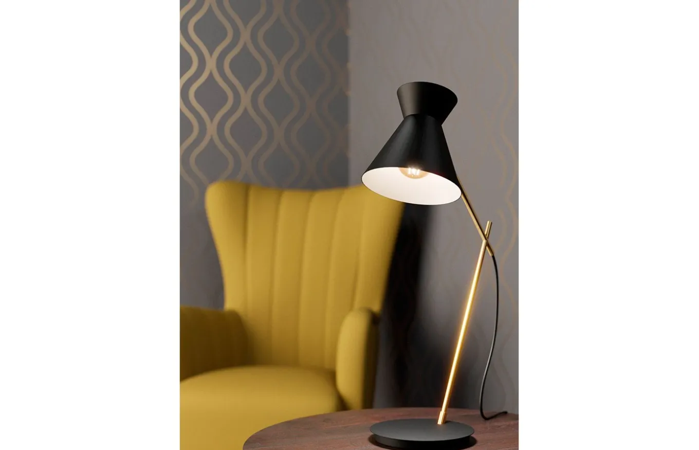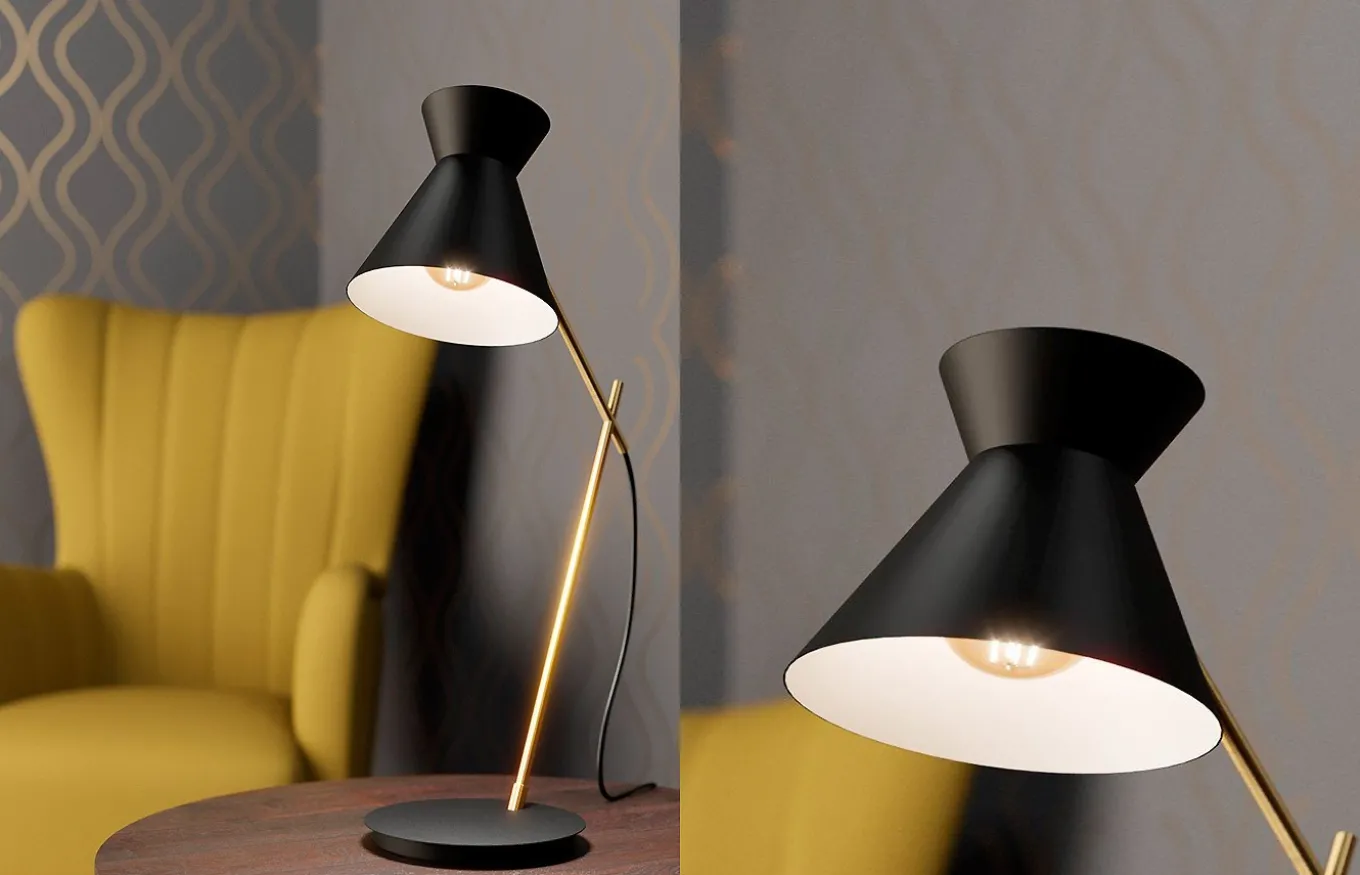 La lámpara de sobremesa Amezaga consta de un brazo de filigrana de metal en latón cepillado, una base de metal negra y una atractiva pantalla de metal del mismo color. La pantalla se combina con un interior en color blanco. Se puede utilizar un interruptor en el cabezal para encender y apagar la lámpara cómodamente.