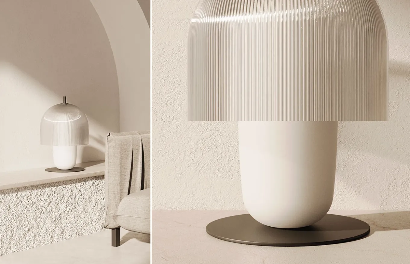 La lámpara de sobremesa Holm de Aromas del Campo es una pieza sofisticada que destaca por su diseño elegante y atemporal. Su elemento más característico es su difusor de cristal transparente estriado, que no solo aporta un toque refinado, sino que también juega con la luz para crear un efecto luminoso envolvente y cálido.