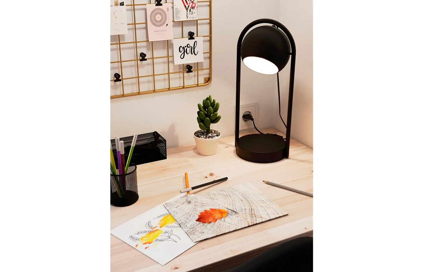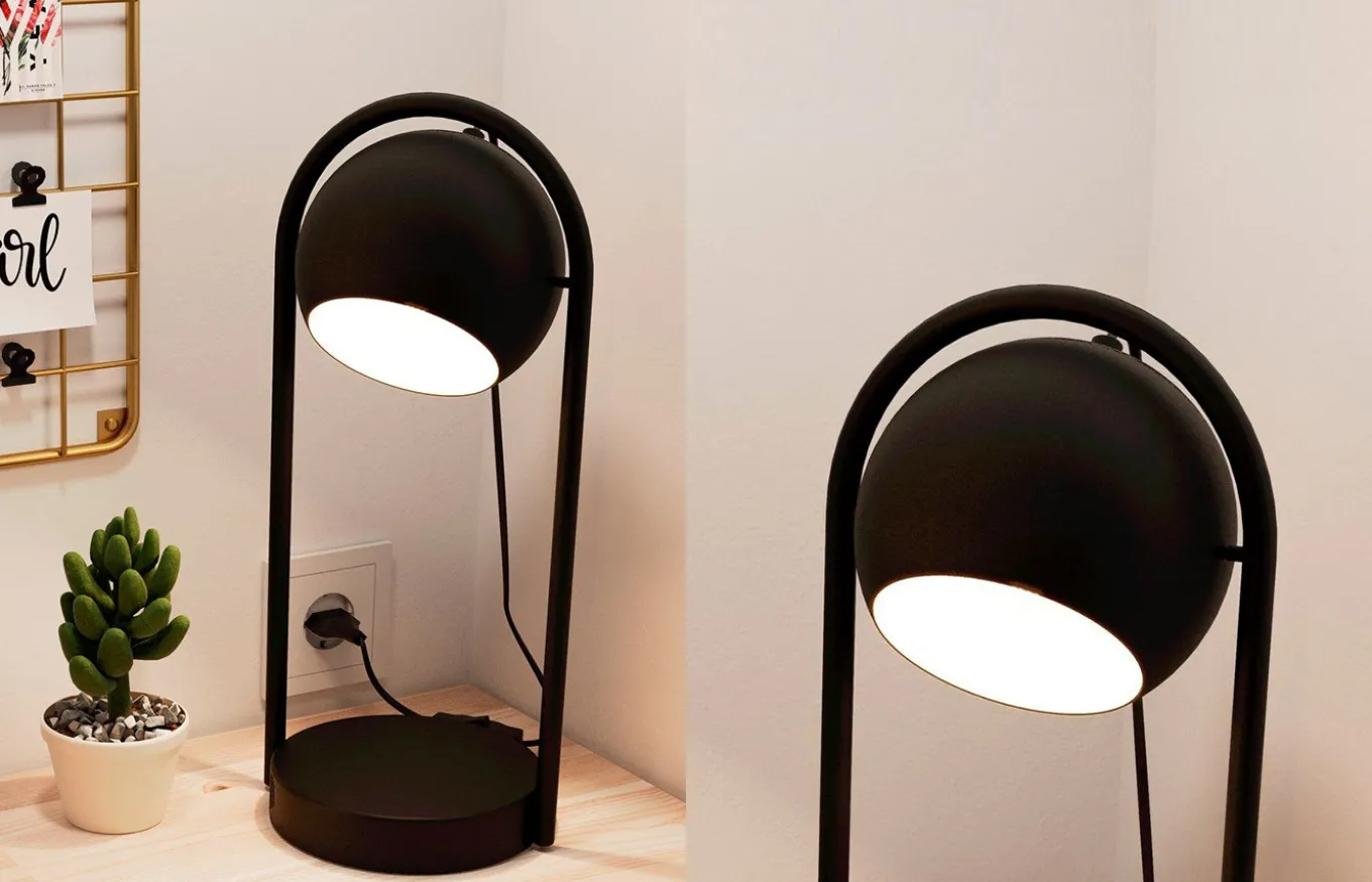 La lámpara de sobremesa Murnia se compone de un cuerpo de metal negro, y una pantalla redonda móvil de metal en color negro en la zona superior. El interior blanco mate de la pantalla garantiza una buena iluminación y completa hábilmente el diseño New Nordic. En el cable se encuentra un interruptor para poder encender y apagar la lámpara cómodamente.