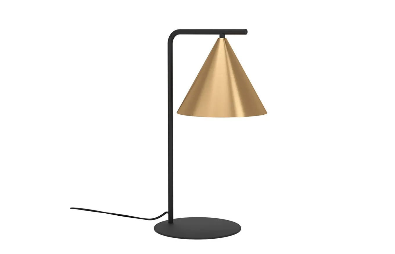 La lámpara de sobremesa Narices está formada por una base curvada de metal en color negro a la que se ha acoplado una pantalla cónica realizada en latón cepillado.
