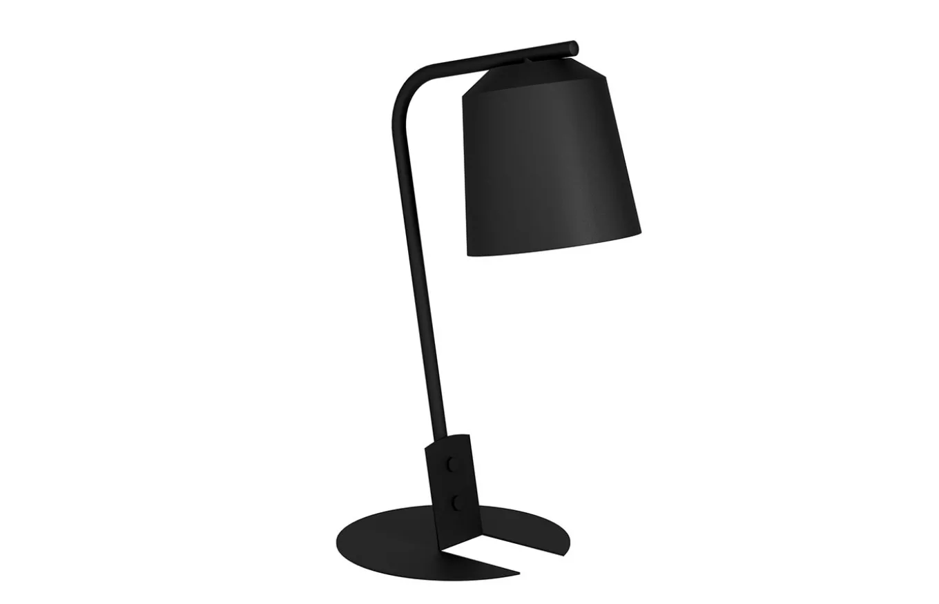 La lámpara de sobremesa Oneda está compuesta por una pantalla cónica fabricada en metal de color negro y un interior en color blanco. La base plana de metal negro, a partir de la cual se dobló hacia arriba un elemento perforado para unir el cuerpo de la lámpara, es particularmente sofisticada.