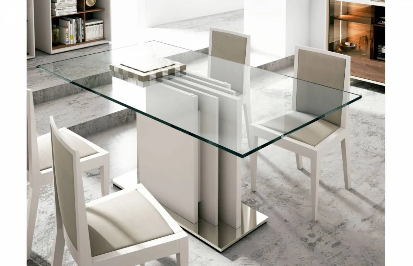 Tiene un diseño atractivo y llamativo con su particular pie central y la tapa de cristal, sin duda una pieza que le otorgará amplitud y luminosidad a cualquier comedor. Tiene a parte dos extensibles que se pueden añadir según se necesite.