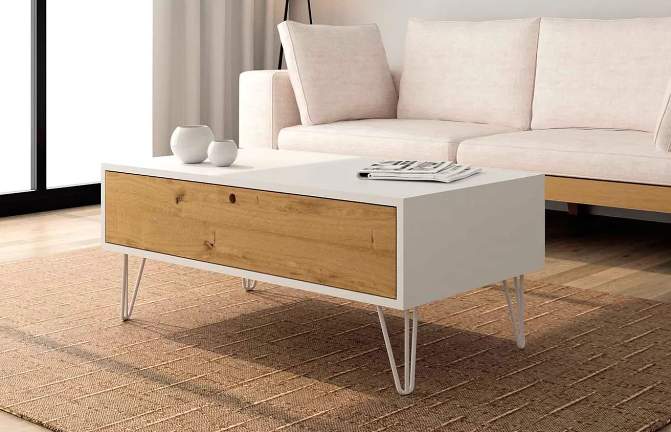 La mesa de centro Oslo diseñada con un estilo moderno y minimalista, destaca por su sencillez, su acabado en madera y patas metálicas lacadas.