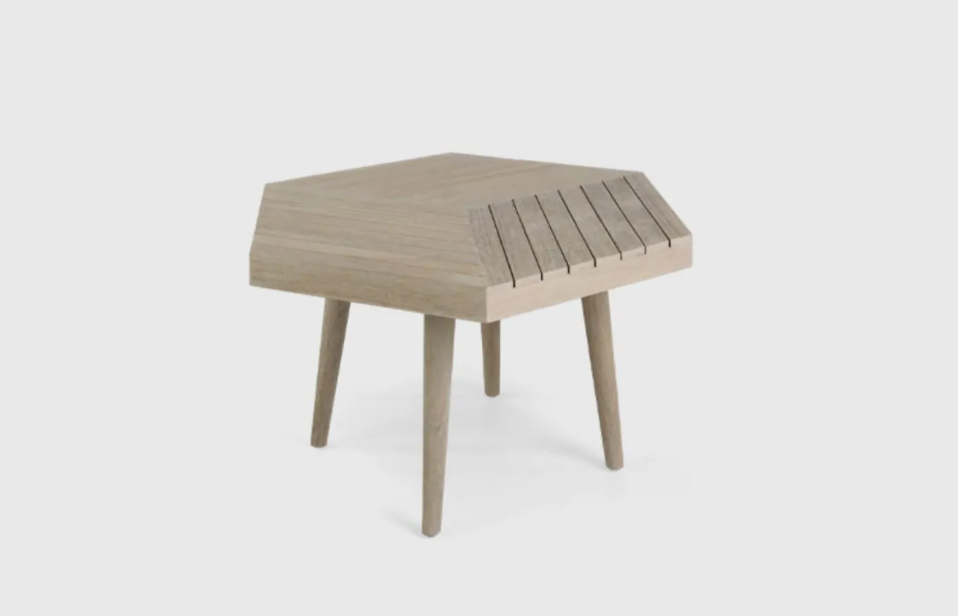 Este mobiliario de serie cuenta con una estructura fabricada en teca con acabado gris rústico.