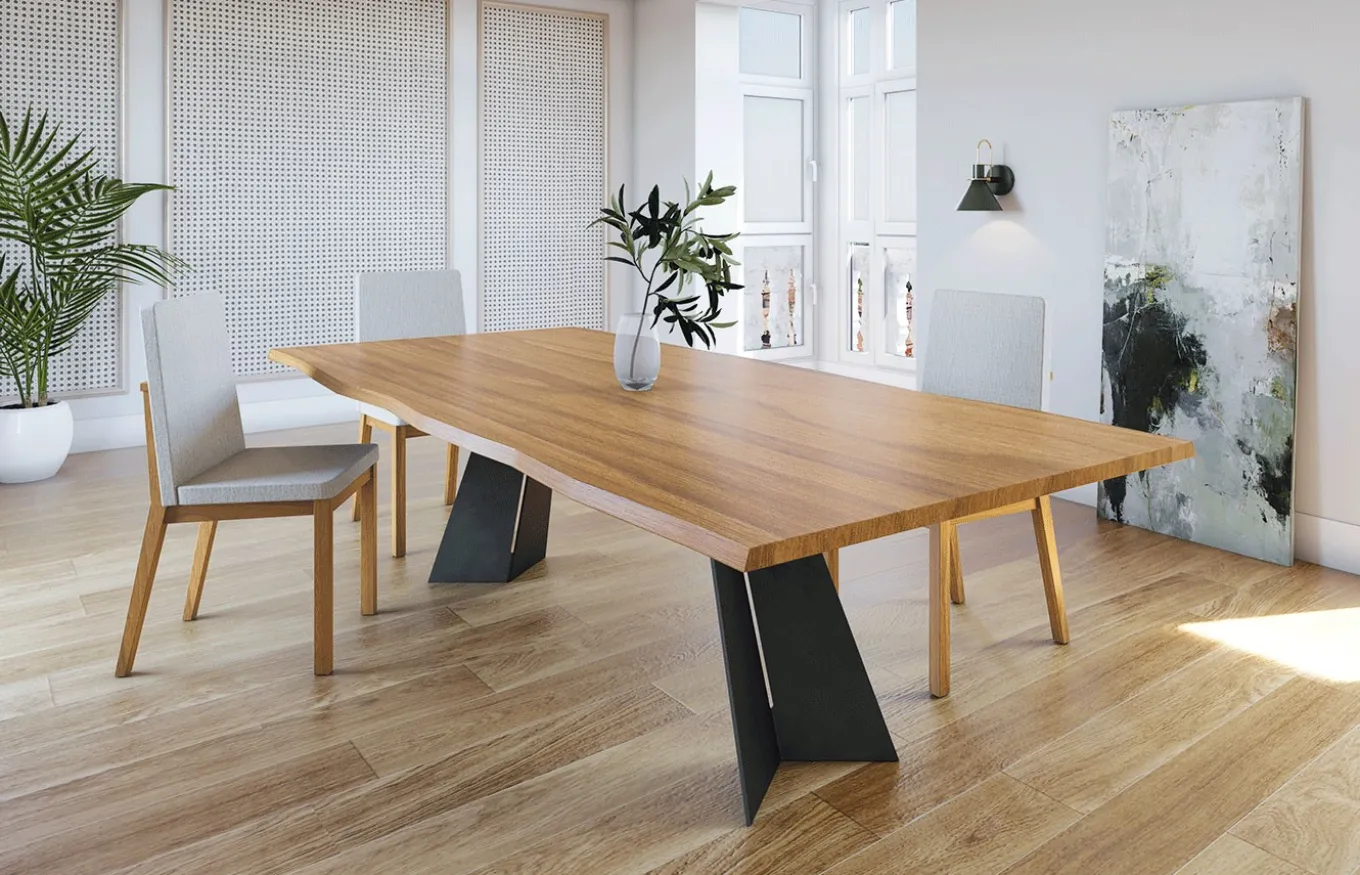 El precio corresponde a la mesa de comedor con tapa en Roble Salvaje con cantos irregulares.