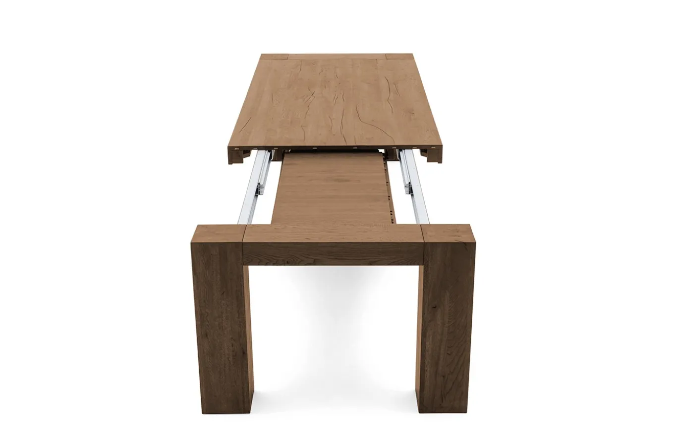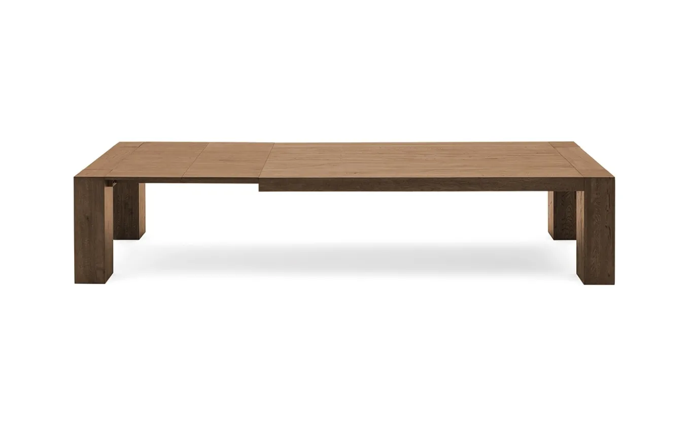 La mesa de comedor Brooklyn es uno de los modelos estrella de la marca, tanto es así que se ha versionado de diferentes maneras para adaptarse a las necesidades del cliente, esta versión es la mesa de comedor extensible. El denominador común de la mesa Brooklyn siempre es su combinación entre la contundencia de sus patas de 20×20 cm y la textura natural de su tapa en roble matérico.