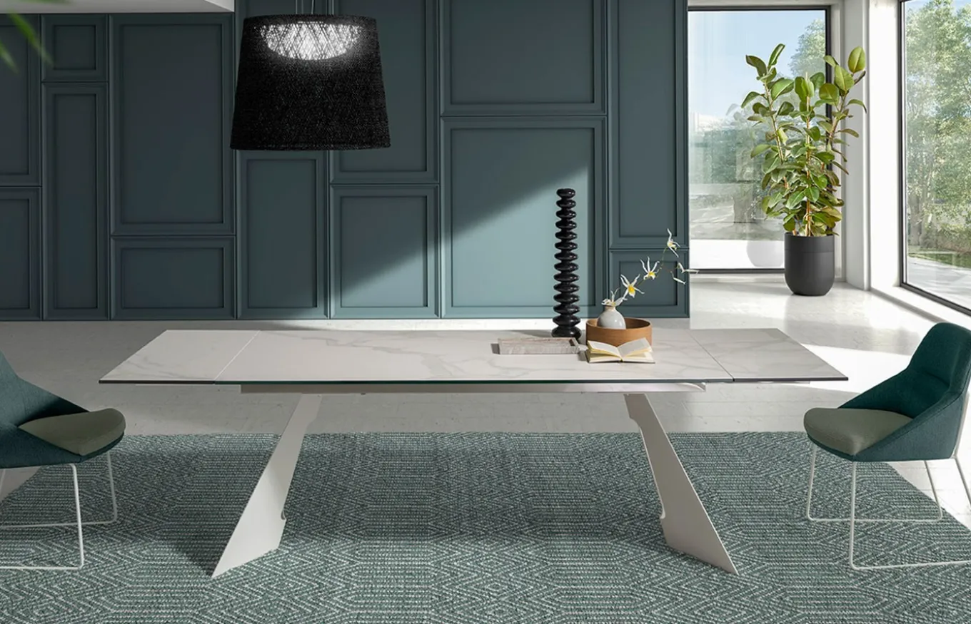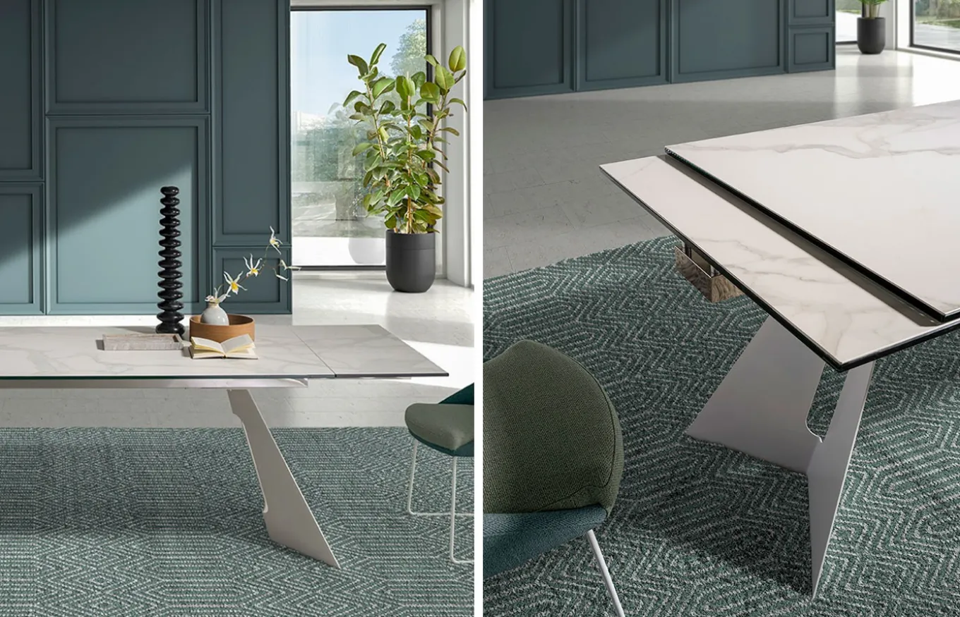 La mesa de comedor extensible Kiv Keramic es una mesa de líneas puras y sencillas que, gracias al diseño, los materiales y los acabados, ilumina el salón. Su fabricación fusiona unas patas metálicas y un elegante tablero porcelánico de 12 mm de grosor.