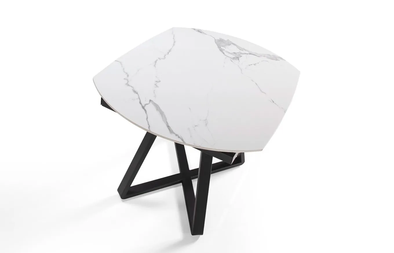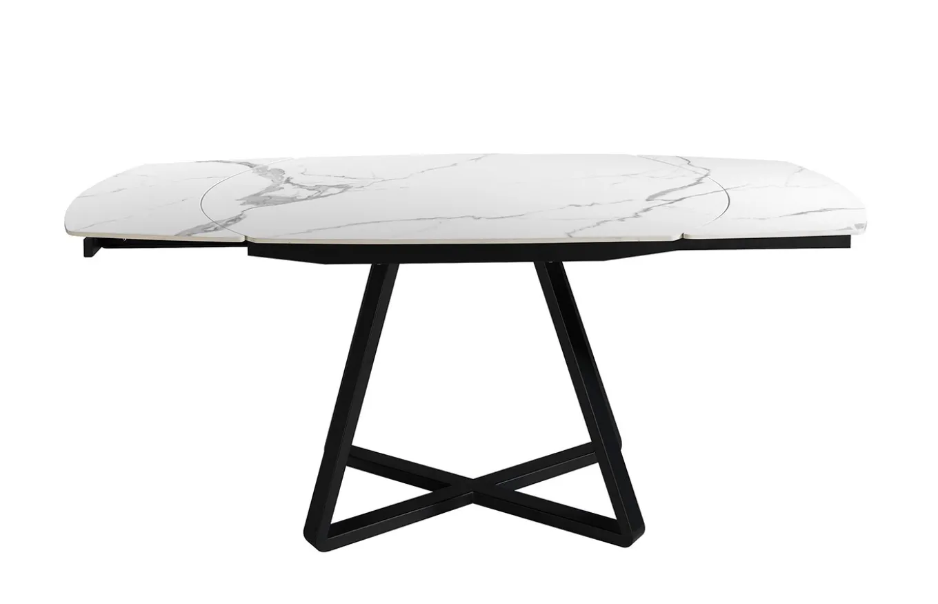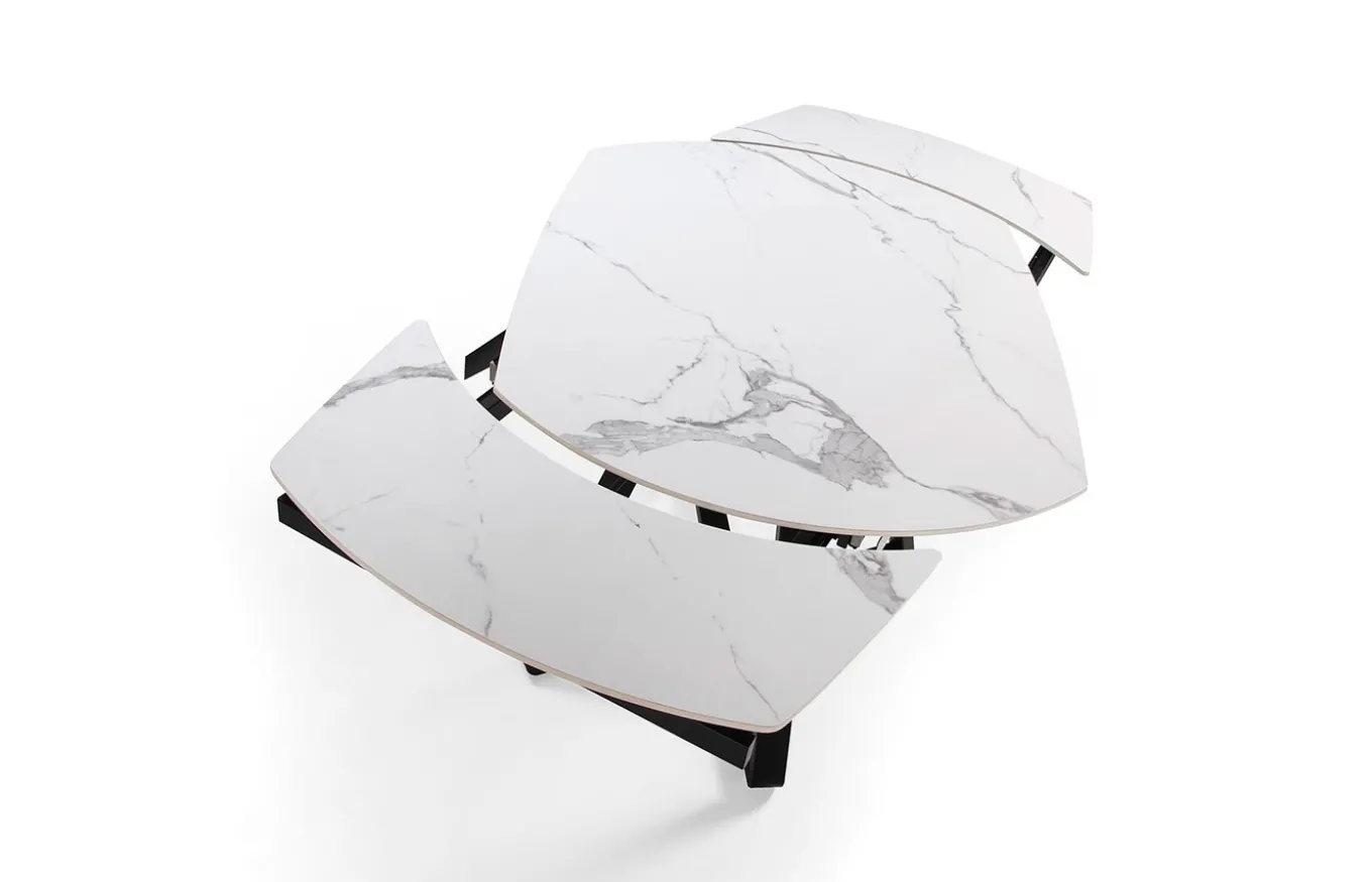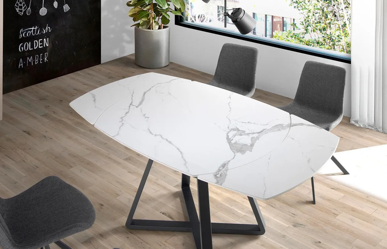 Mesa de comedor con forma ovalada barril, extensible a través de mecanismo de apertura giratoria automática. Su tapa de mármol porcelánico de 6 mm de espesor, así como su estructura fabricada en acero epoxi tintado en color negro, hace de esta mesa, una pieza exclusiva y única para tu comedor. Por sus dimensiones y forma, así como por sus extensibles de 30 cm, es perfecta para acomodar de forma práctica y con el máximo confort a tus comensales.