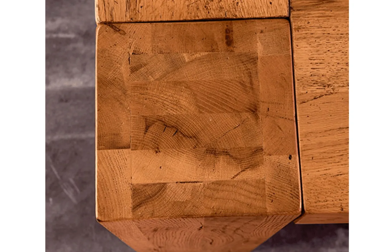 - Robustas patas de 20×20 cm fabricadas también en roble matérico.