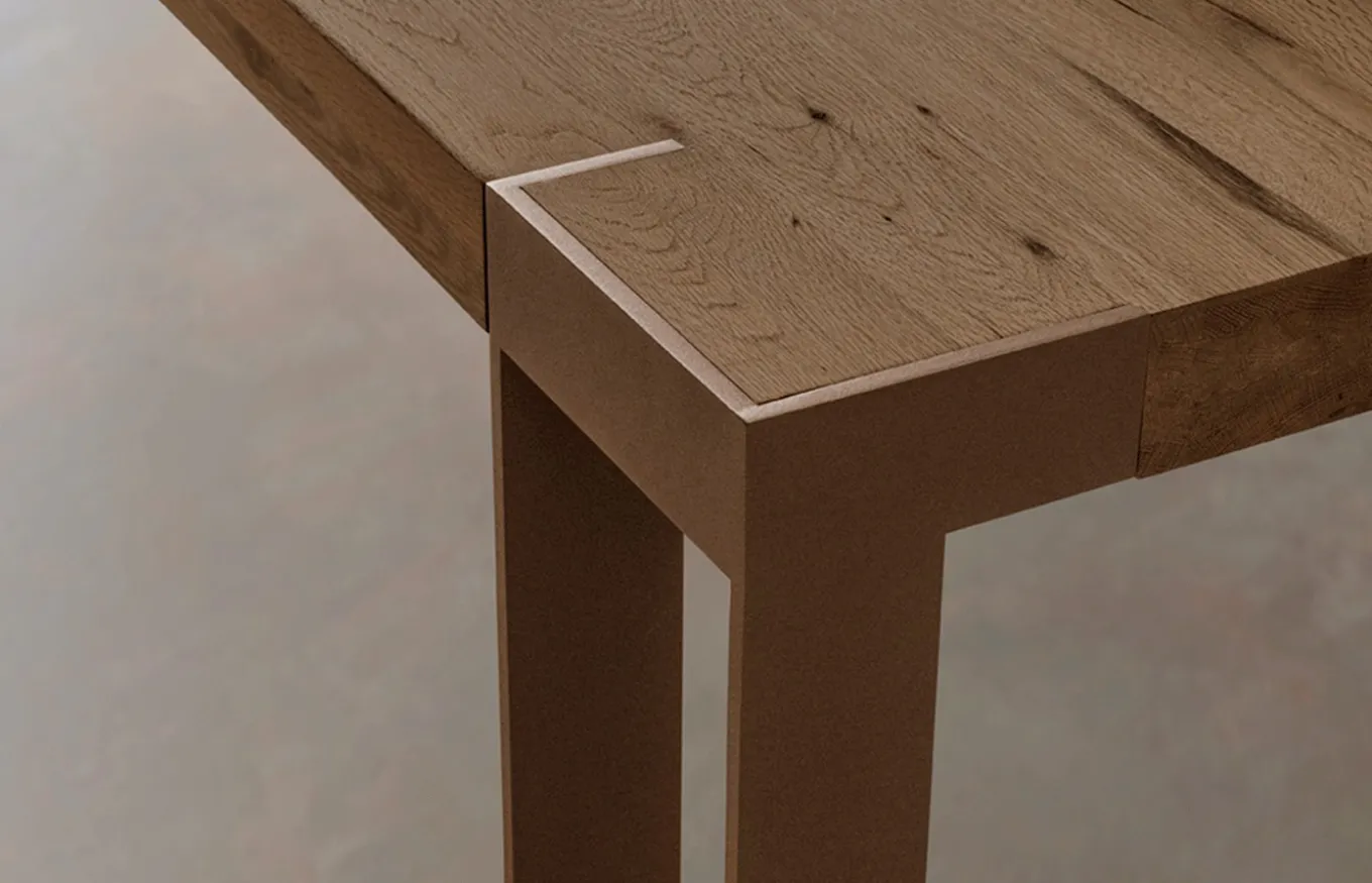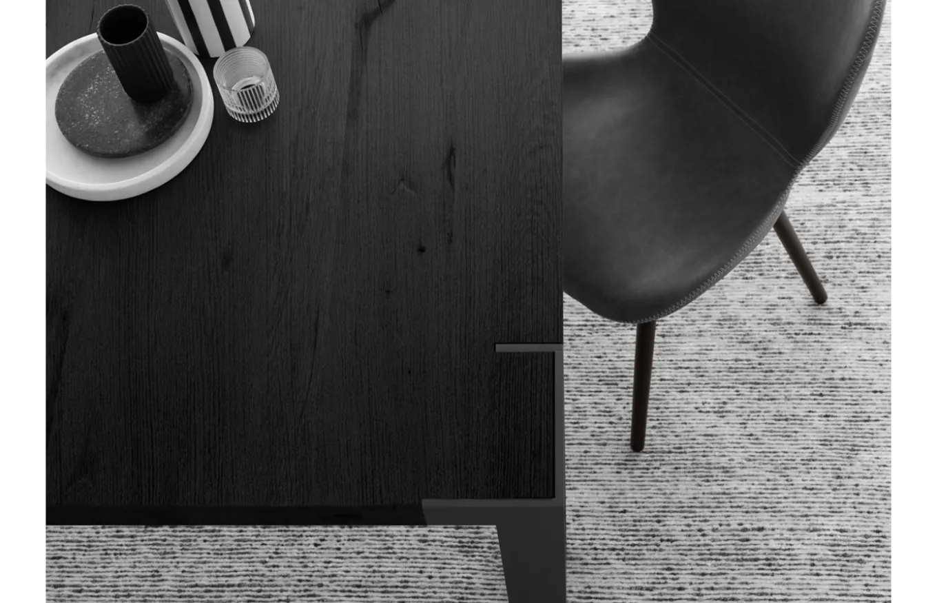 La mesa de comedor Frame destaca por sus líneas rectas y su estilo moderno con aire industrial. Su punto fuerte es el encuentro entre la pata y el tablero de la mesa, un detalle impecable que hace que la madera y el hierro se fusionen como un solo elemento.