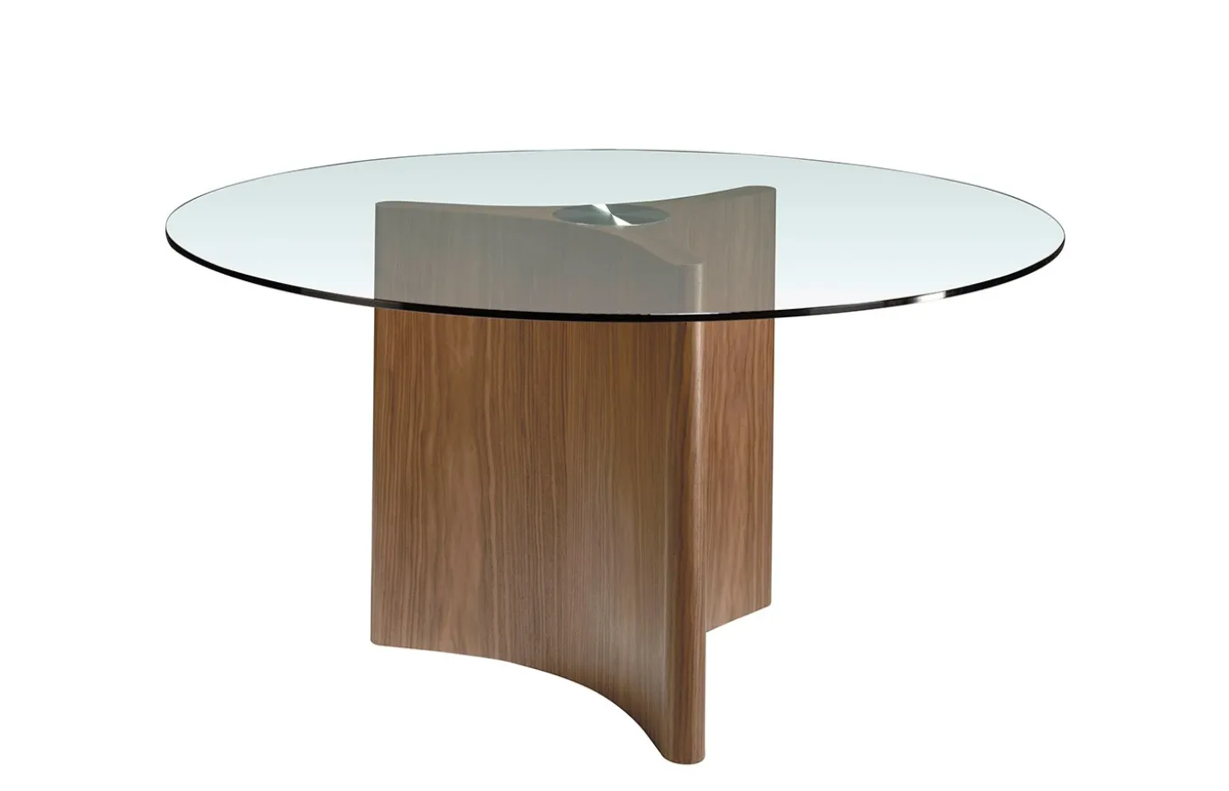 Mesa comedor redonda de diseño moderno de tapa fija de cristal templado de 10 mm y cantos pulidos. Su original base de madera maciza de pino con chapa de nogal natural de 0.5 mm de espesor aporta calidez a la vez que luminosidad al espacio. Una pieza que se caracteriza por su estilo elegante y sobrio, perfecta por sus dimensiones, tanto para comedor como para cocina.