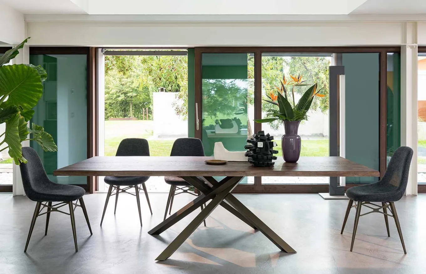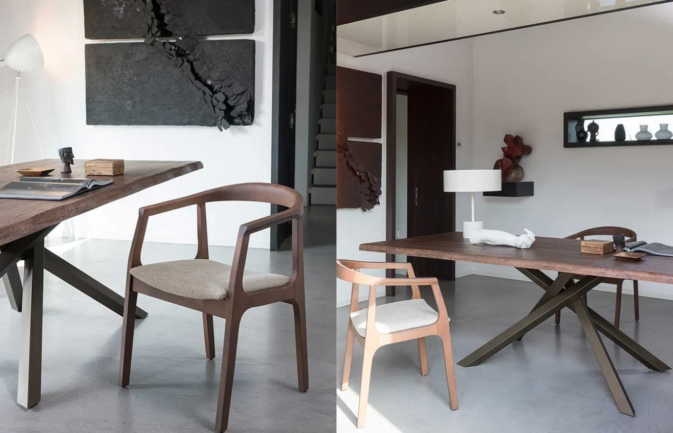 Mesa de comedor Ghemon combina la ligereza estética con una gran solidez. El diseño de Rivanova es muy funcional, fácil de interpretar, pero al mismo tiempo rico en detalles dados por los materiales utilizados: madera natural, cristal y hierro. Rivanova selecciona la madera por su singularidad, realzada por imperfecciones naturales que son consideradas parte integrante del resultado final que se quiere conseguir.