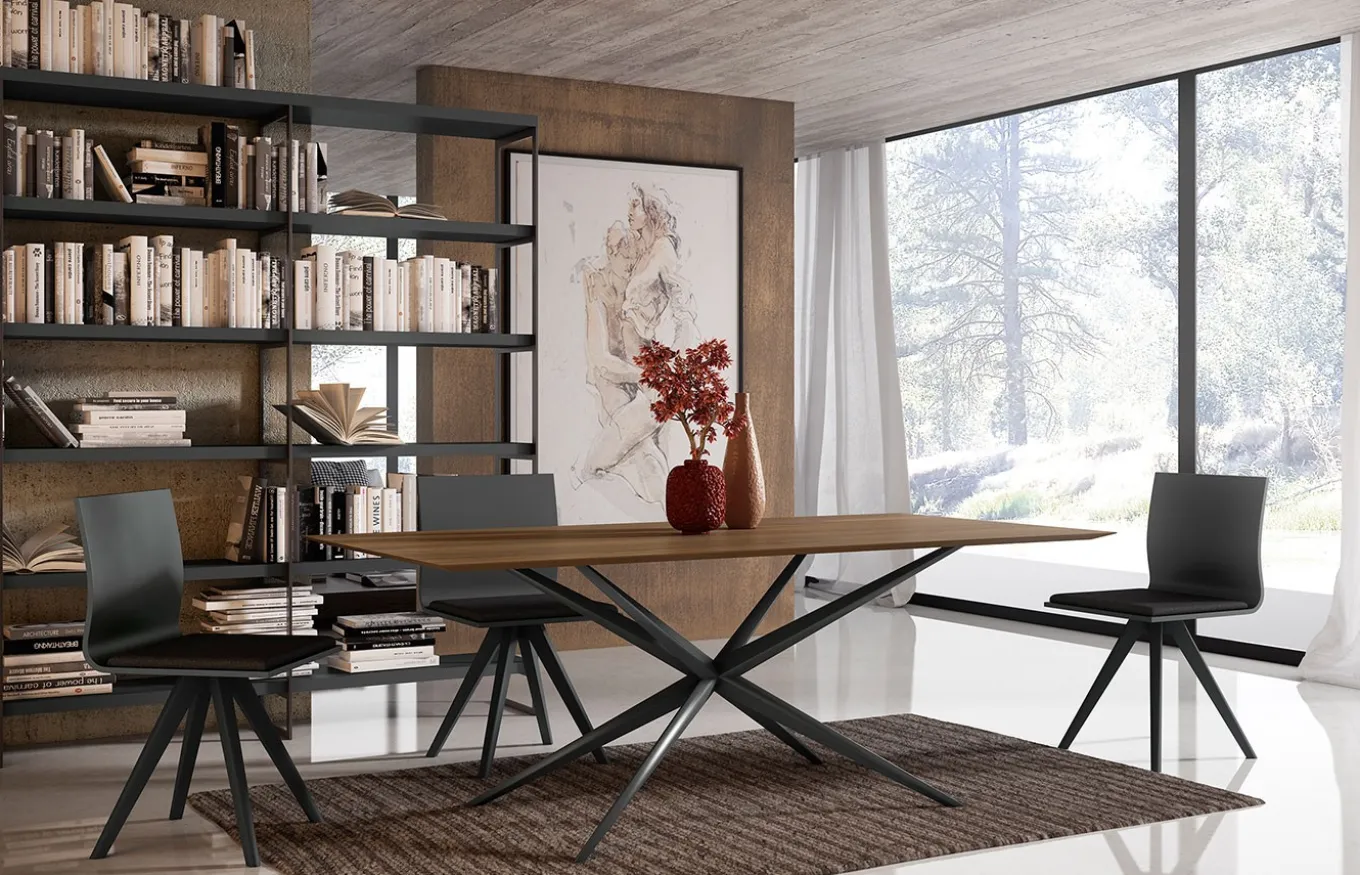 La mesa de comedor Lennox tiene un diseño muy actual que combina sus originales patas en acabado lacado grafito, con un tablero de elegante acabado en Nogal Americano con vetas que resaltan la calidez de la madera. Se adapta perfectamente a cualquier estilo decorativo gracias a su diseño atemporal.