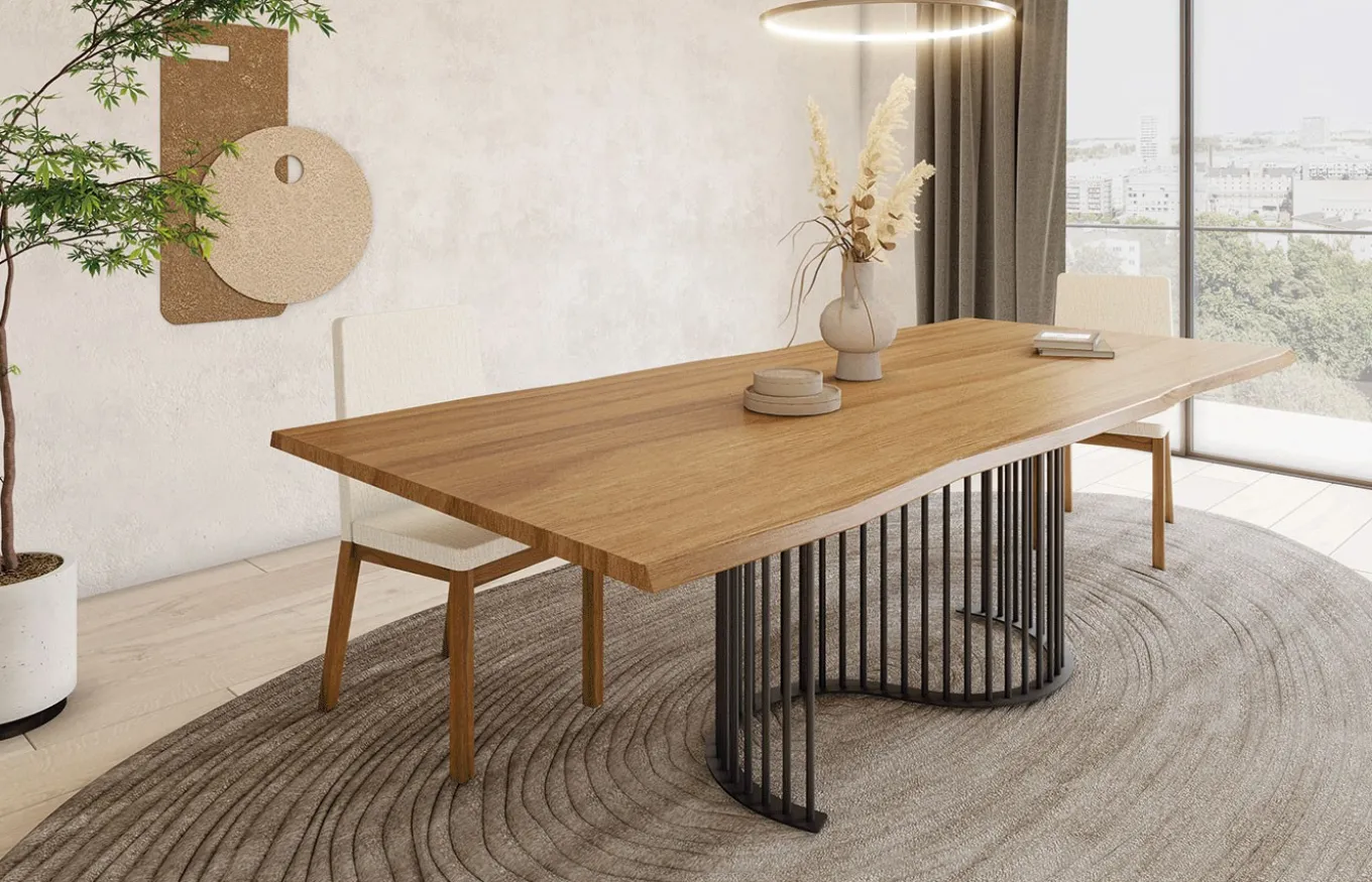 El precio corresponde a la mesa de comedor con tapa en Roble Salvaje con cantos irregulares.