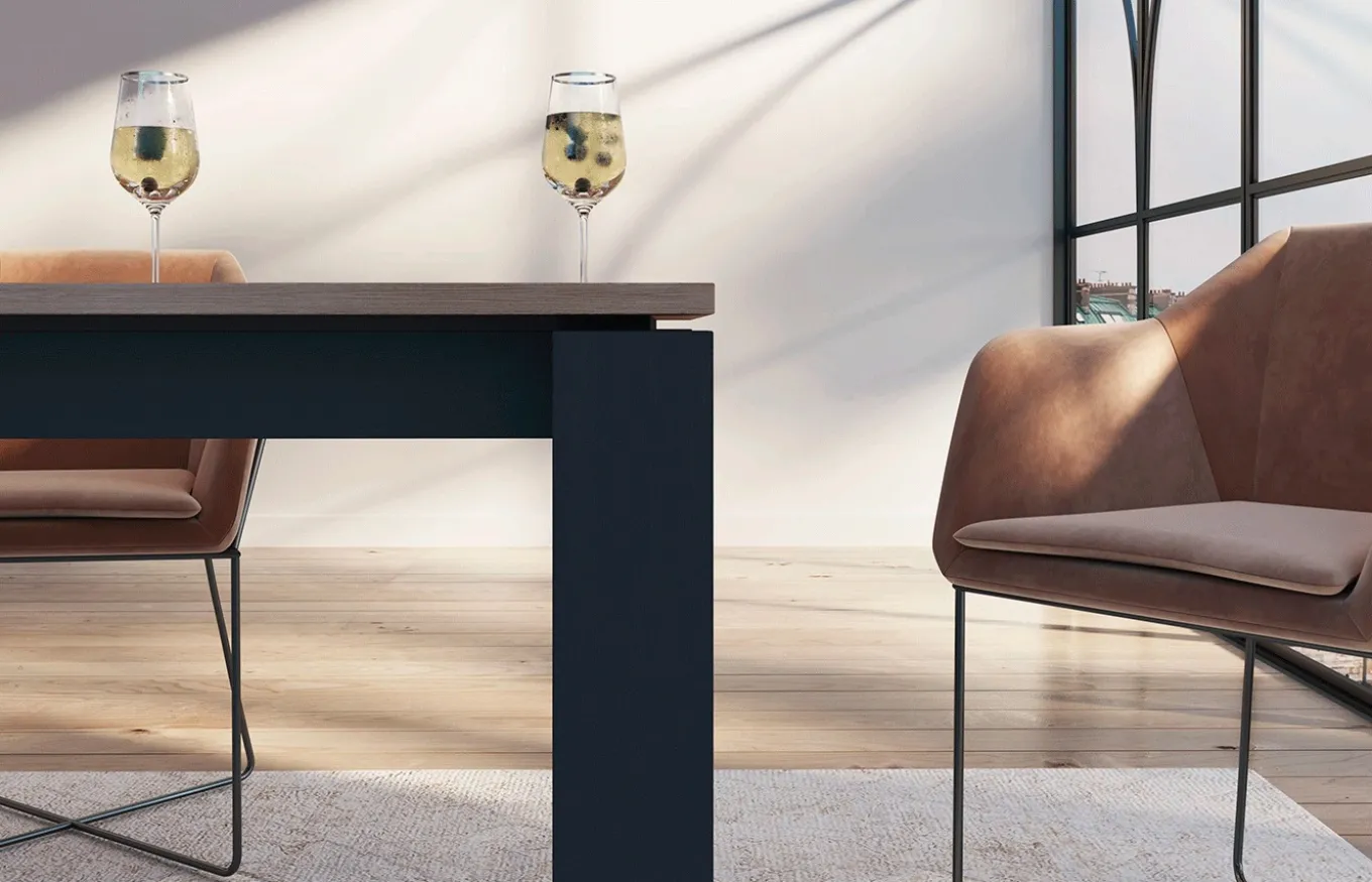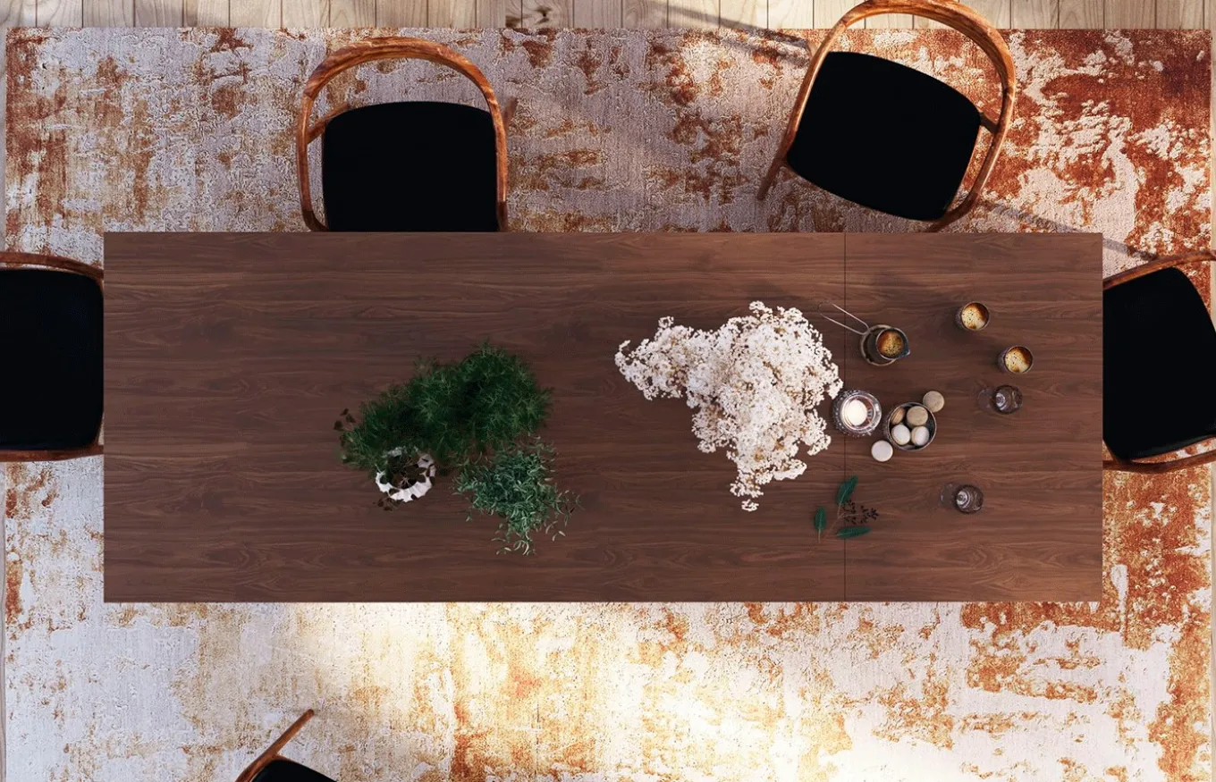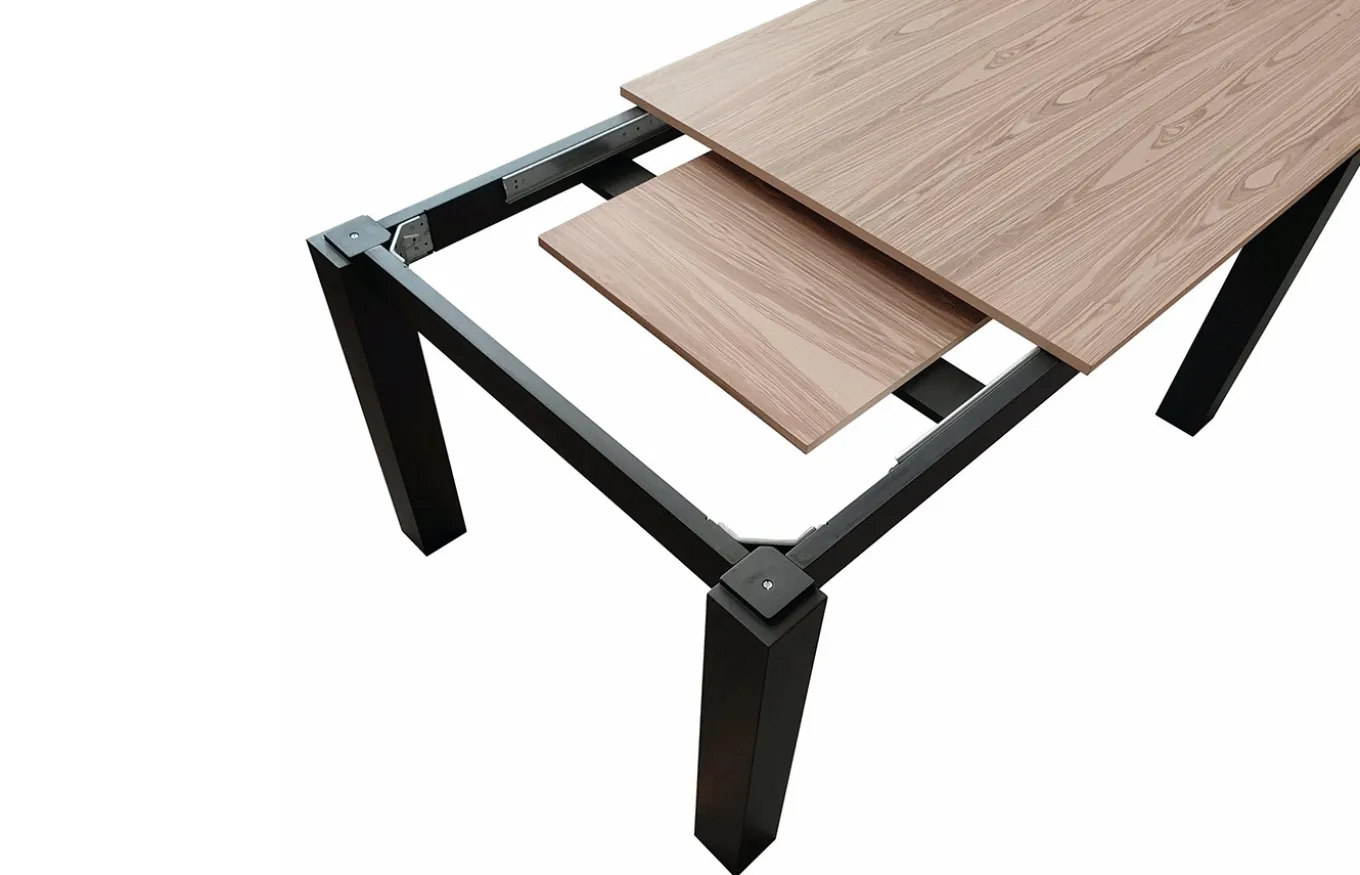 Mesa de comedor extensible con un diseño neutro y minimalista capaz de encajar en estancias de varios estilos, lo que hace de ella una mesa muy polivalente. El sistema de apertura es mediante el deslizamiento de la tapa (ver fotos).