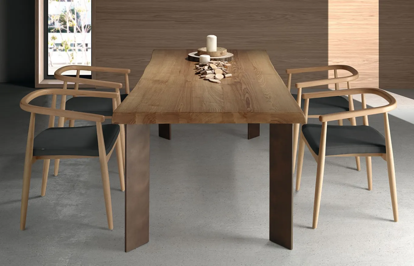 La mesa de madera maciza Priego de Almosa es una pieza que destaca por su equilibrio entre diseño contemporáneo, robustez y funcionalidad. Está fabricada con un tablero de madera maciza de fresno de 5,3 cm de grosor. Su tablero se apoya sobre cuatro patas metálicas con perfil en diagonal, un diseño que aporta dinamismo visual y ligereza sin renunciar a la estabilidad.