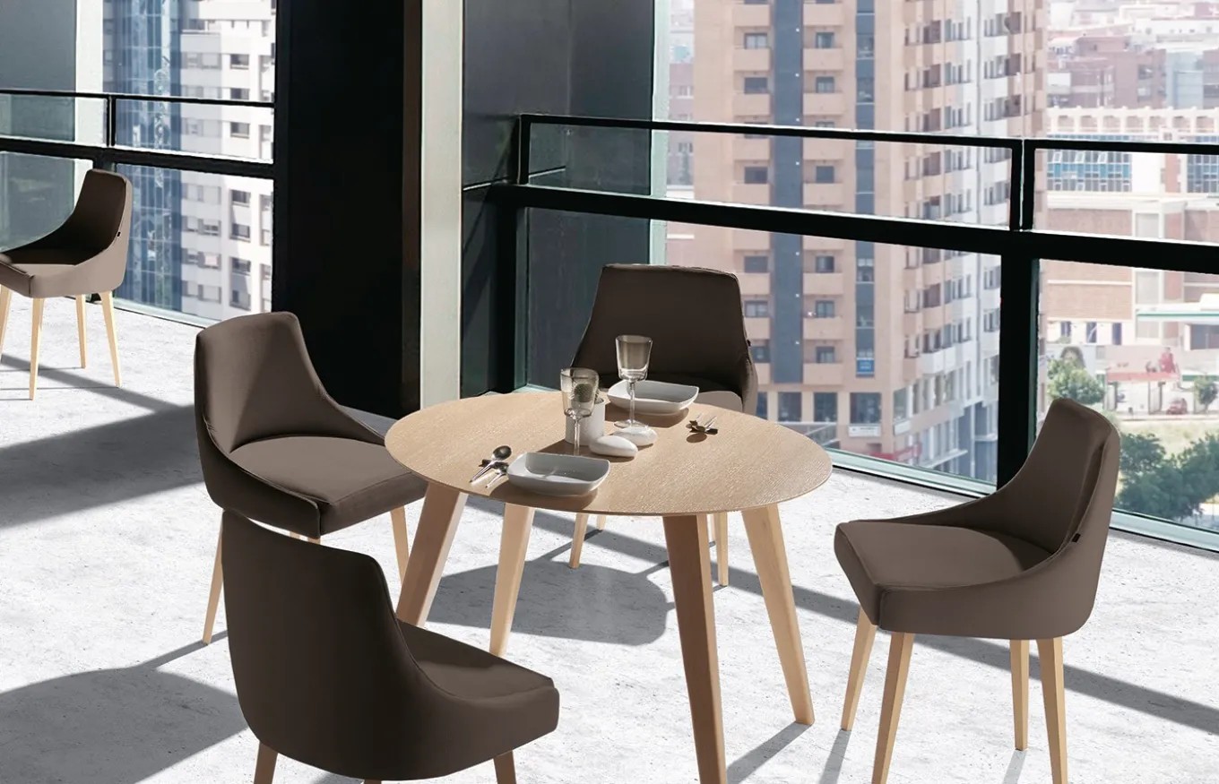 La mesa redonda Isaba de Almosa es una pieza de mobiliario que destaca por su elegante sencillez y su carácter cálido y natural. Está fabricada íntegramente en madera, con la opción de elegir entre madera de Mukali o Roble, dos materiales que aportan personalidad y durabilidad a la pieza. Su fabricación completamente en madera realza la nobleza del material.