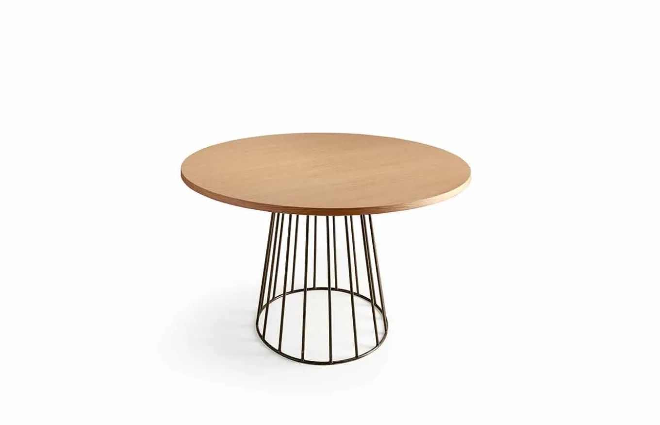 La mesa redonda de madera Tui de Almosa combina diseño contemporáneo y funcionalidad, destacando por su tapa fija de madera de haya, disponible en varios acabados y colores. Su tapa descansa sobre una base metálica redonda compuesta por varillas, que le confieren un aire ligero y moderno. Esta estructura no solo garantiza estabilidad, sino que también aporta un atractivo contraste entre la calidez de la madera y la estética industrial del metal.
