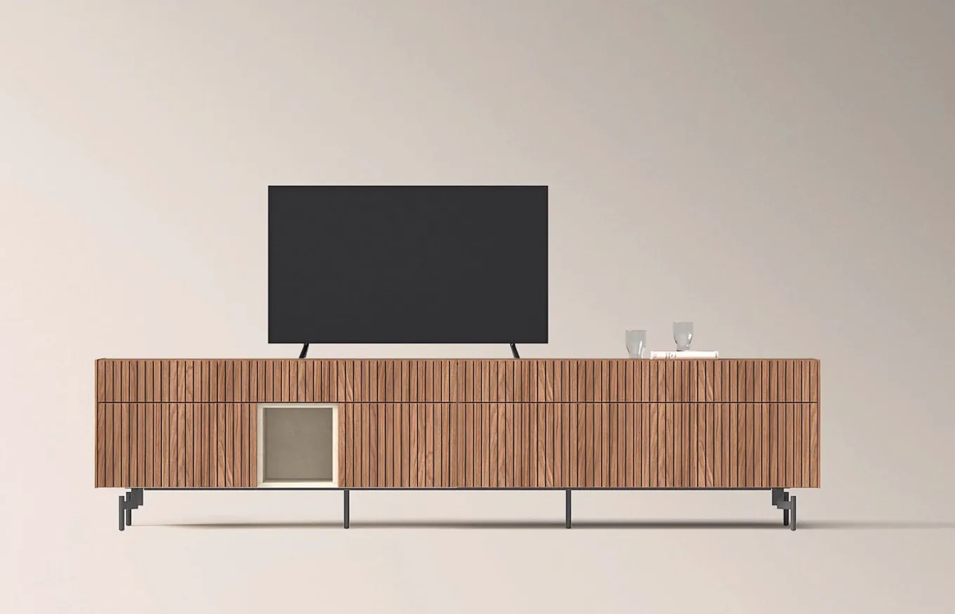 La elegancia rebosa en la sencillez, es así como el mueble tv 206 capta la atención de la estancia. El detalle alistonado de los frentes dota al mobiliario de ser un mueble muy particular y personal.