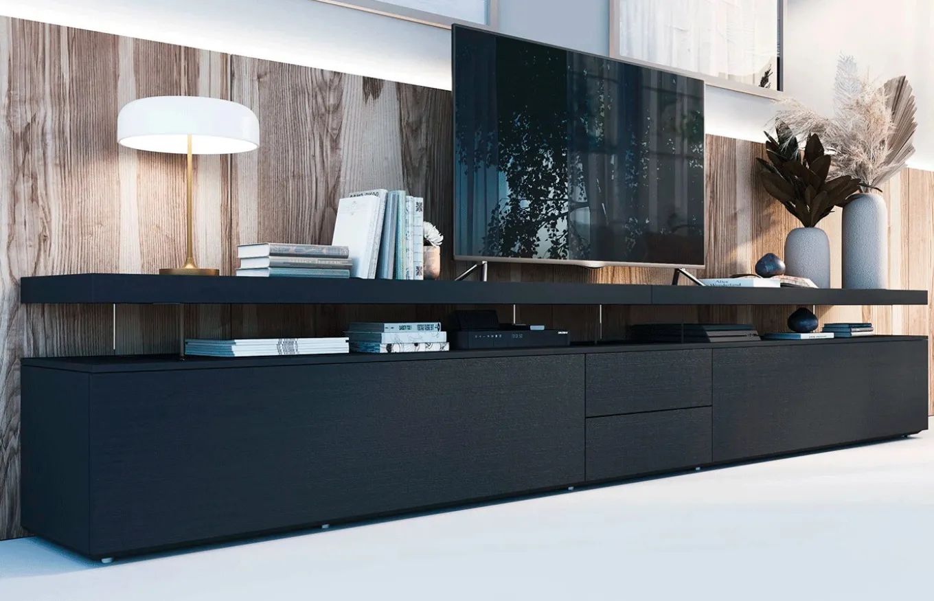 - Composición para televisión formada por varios módulos T16, dos cajones en la parte central y una puerta abatible a cada lado. Lleva una tapa de 6 cm atamborada apoyada sobre patas de metacrilato que le confiere un diseño diferente a la vez que deja un pequeño espacio de almacenaje abierto.