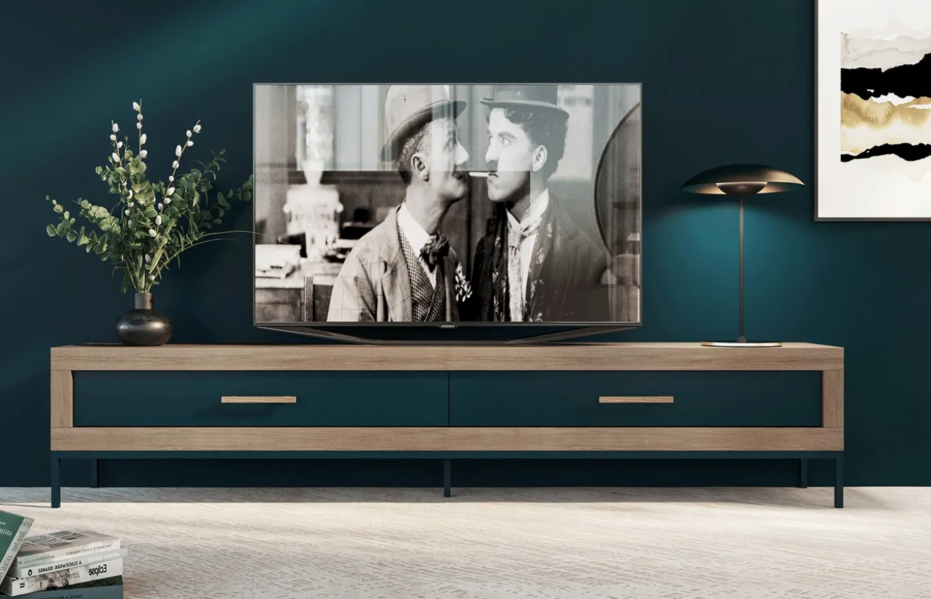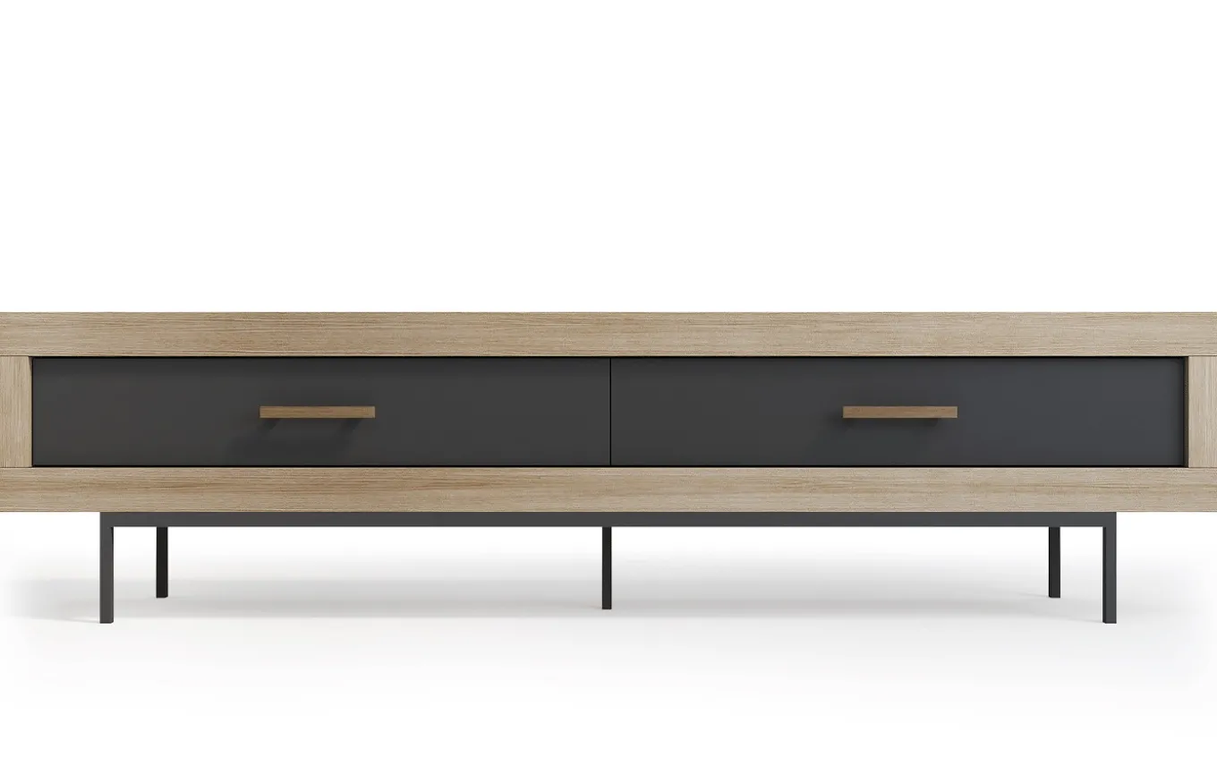 - El mueble TV se compone de dos cajones con tiradores modelo asa, al contrario que otros modelos de mueble T 60.