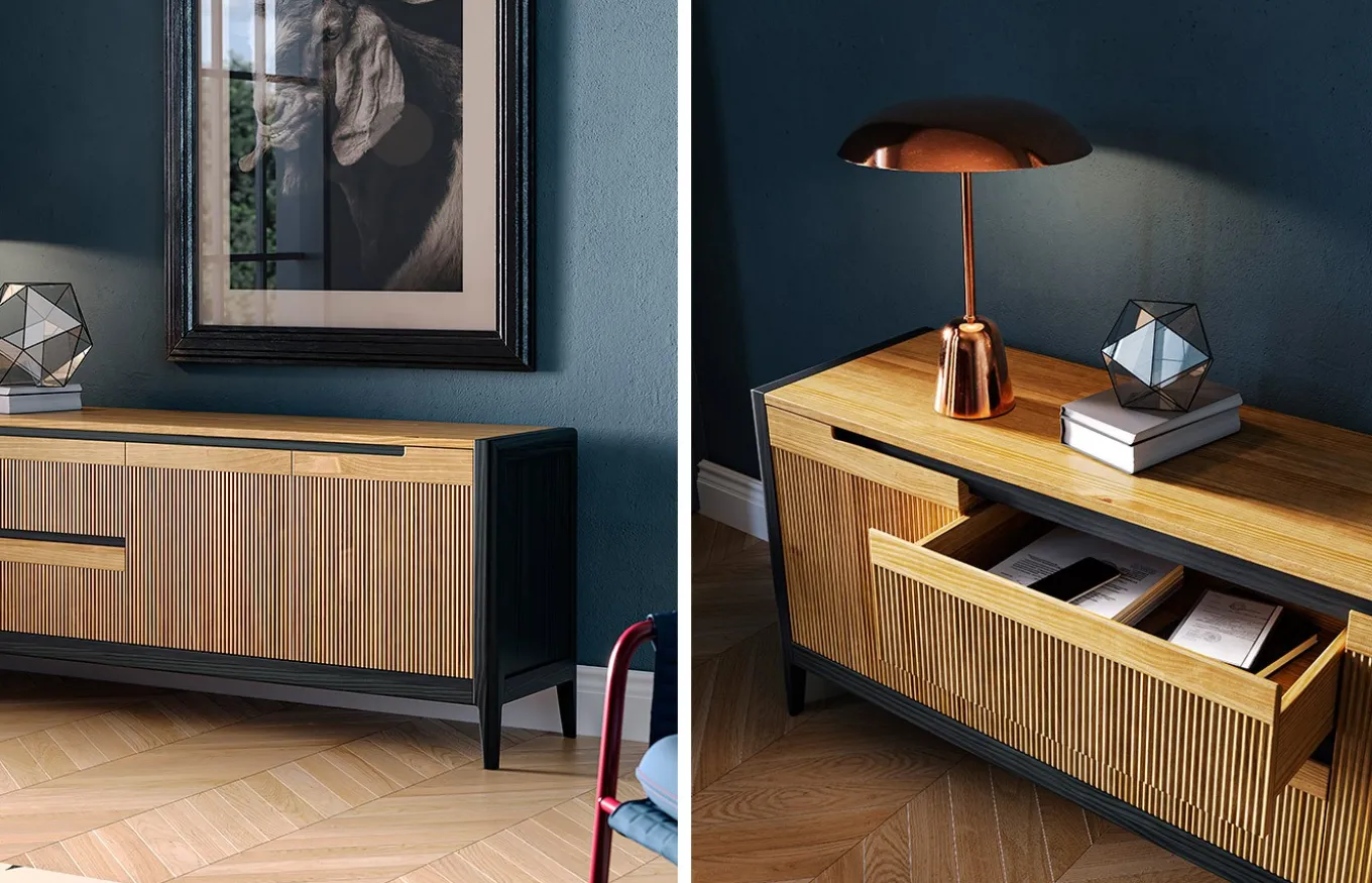 Mueble Tv Tallín es ideal para realzar, de manera sofisticada, el salón de tu hogar. Fabricado en madera maciza de pino, es un material que destaca por su dureza, elegancia y resistencia. Dispone de tres puertas batientes y dos cajones extraíbles con frentes acanalados.