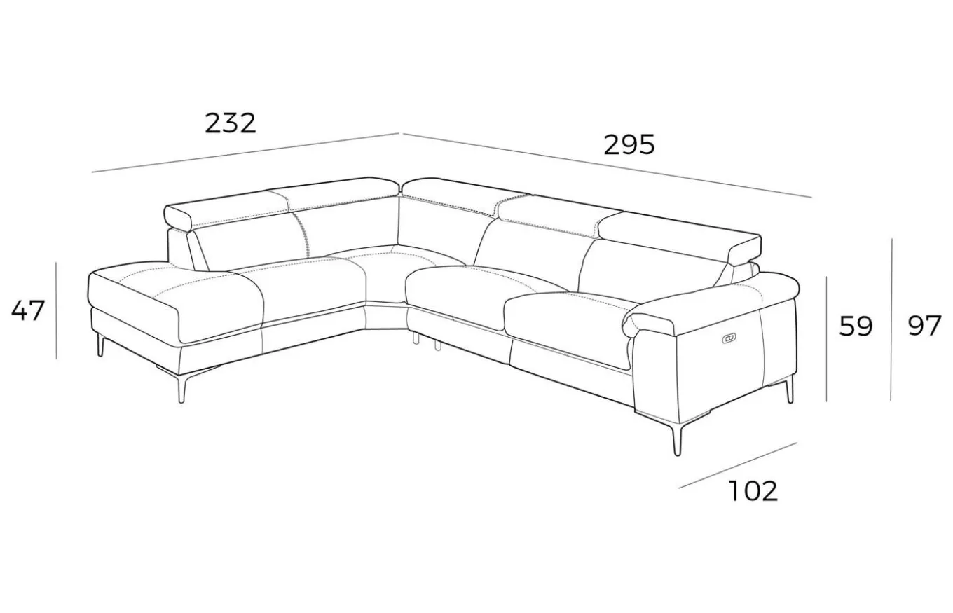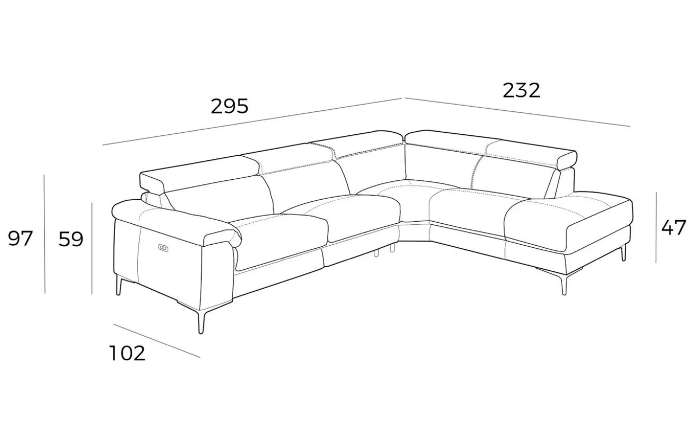 - 295 cm ancho x 232 cm fondo x 97 cm alto.