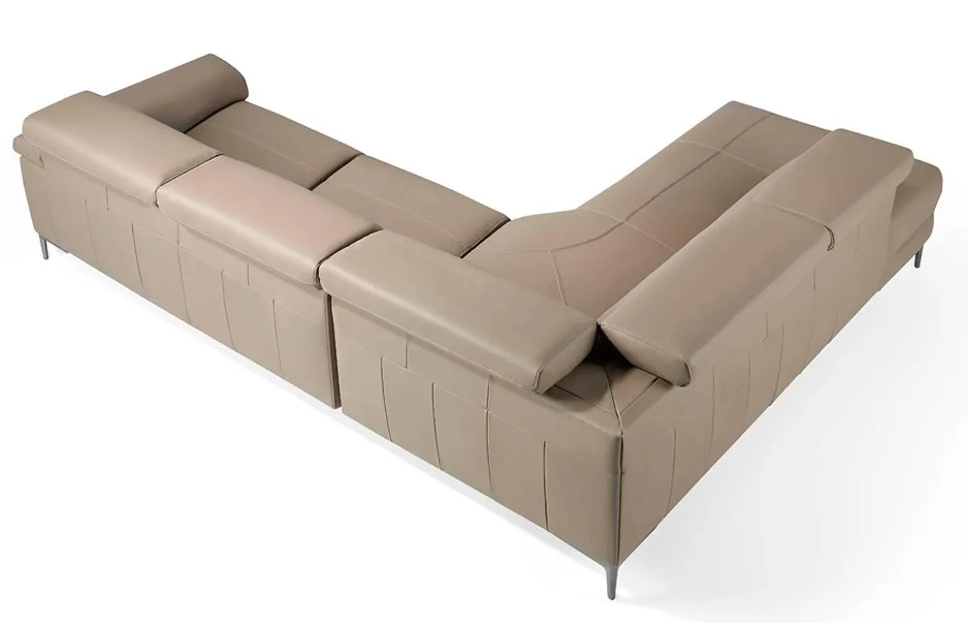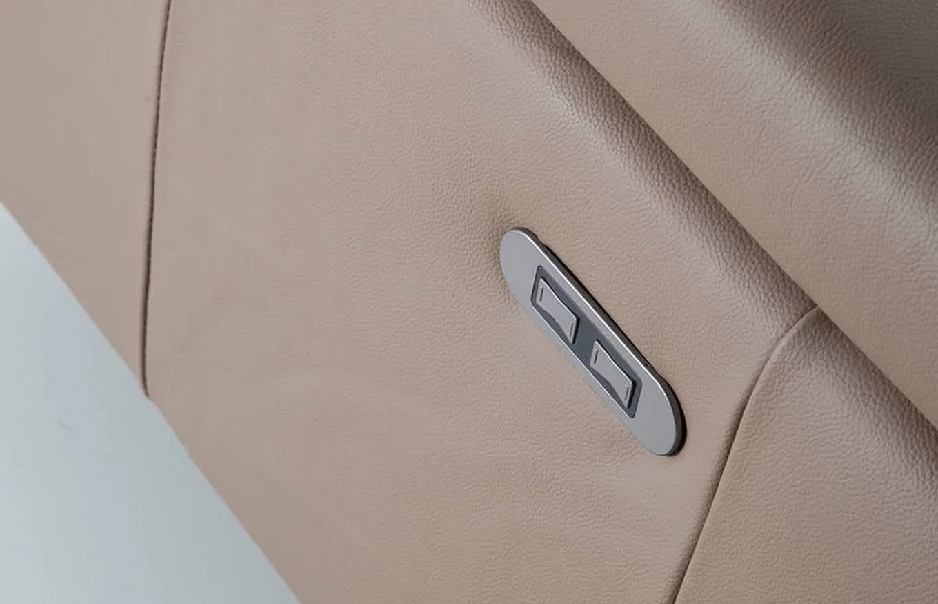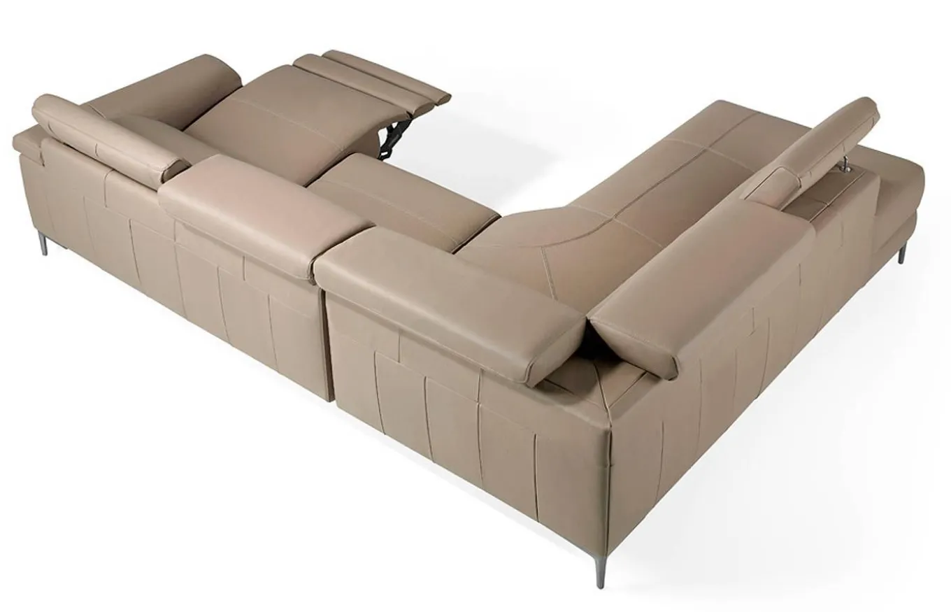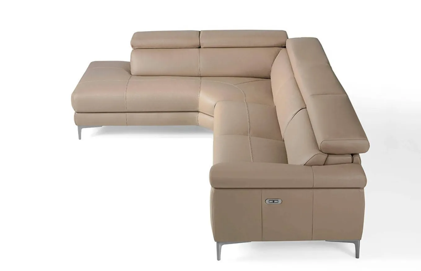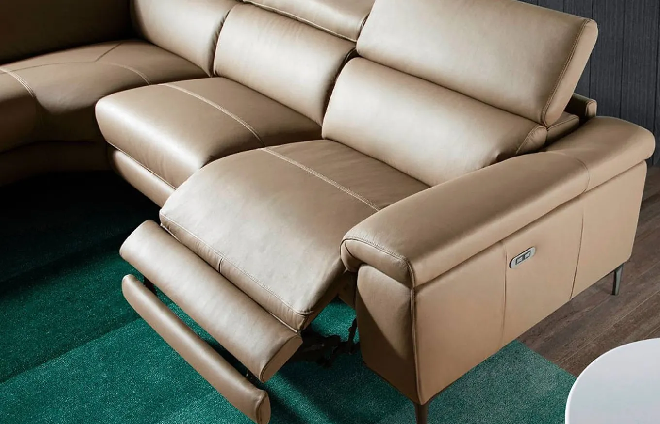 Rinconera de estilo moderno con asiento relax eléctrico, tapizado en piel de color visón y patas de acero.