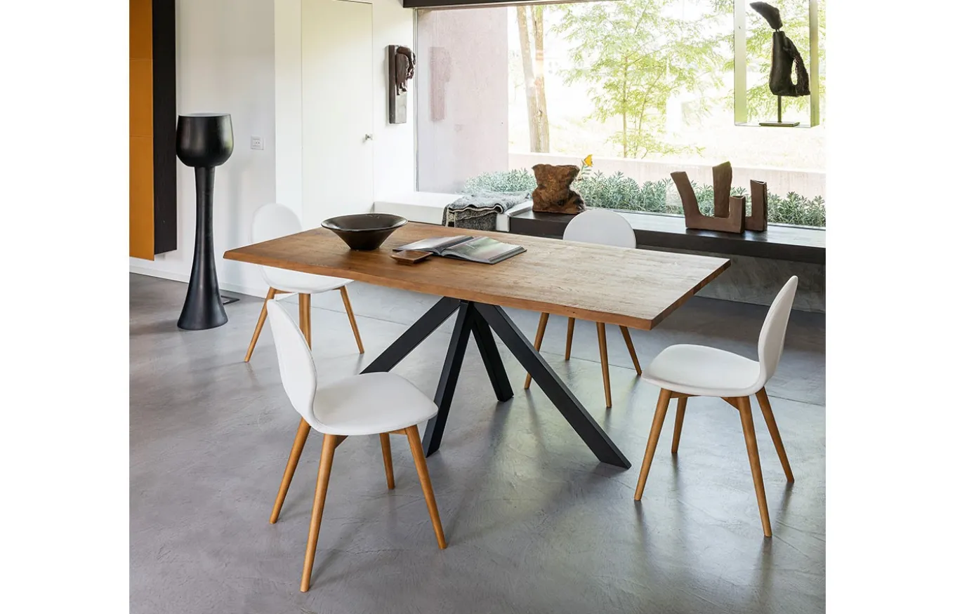 Silla Nina de comedor de estilo moderno. El diseño de Rivanova es muy funcional, fácil de interpretar, pero al mismo tiempo rico en detalles dados por los materiales utilizados: madera natural, cristal y hierro. Rivanova selecciona la madera por su singularidad, realzada por imperfecciones naturales que son consideradas parte integrante del resultado final que se quiere conseguir.