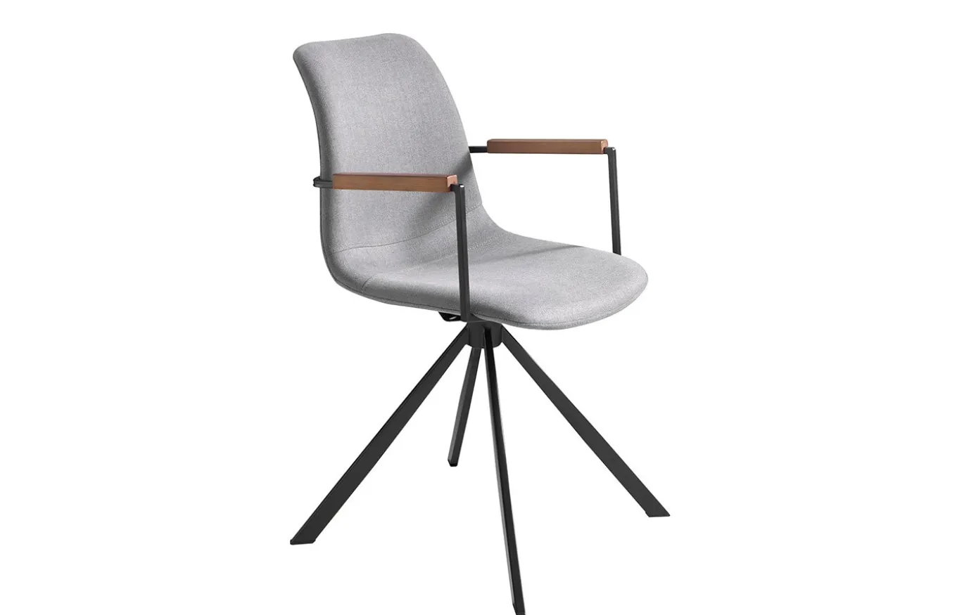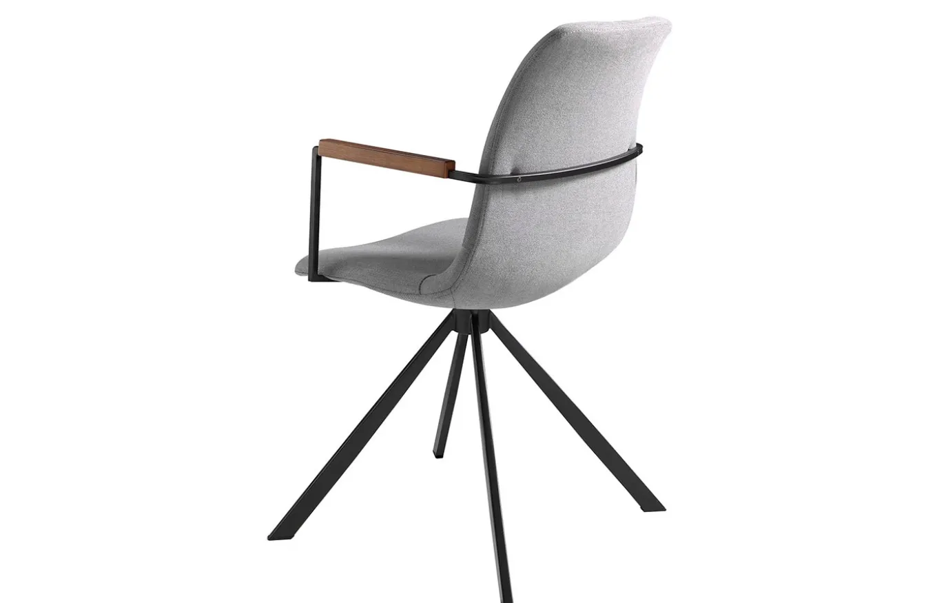 Silla giratoria de diseño moderno tapizada en tela color gris. Una silla de tendencia y estilo atemporal con patas de acero tintado en epoxi color negro que se convertirá en el must have de tu comedor. Su asiento de espuma de poliuretano de 25kg/m3 y diseño envolvente le aportará ese estilo único y personal al espacio, a la vez que le otorgará la mayor comodidad.