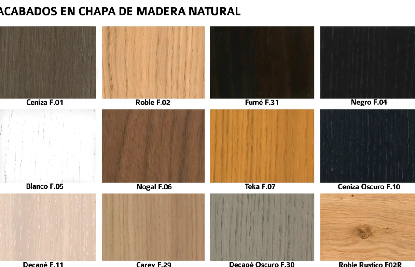 - Acabados A: Incluye los acabados en chapa natural y chapa natural con frentes en laca mate mate.