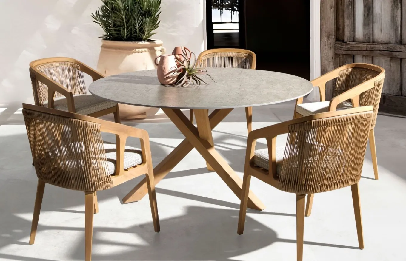 La colección de exterior Río de Joenfa ofrece muebles cálidos y rústicos, perfectos para jardines y terrazas, fabricados con materiales de alta calidad. La colección está diseñada para resistir el clima y brindar comodidad. Joenfa es una empresa española especializada en mobiliario de interior y exterior, destacando por su uso de materiales naturales y sostenibles como la teca reciclada y fibras artesanales.