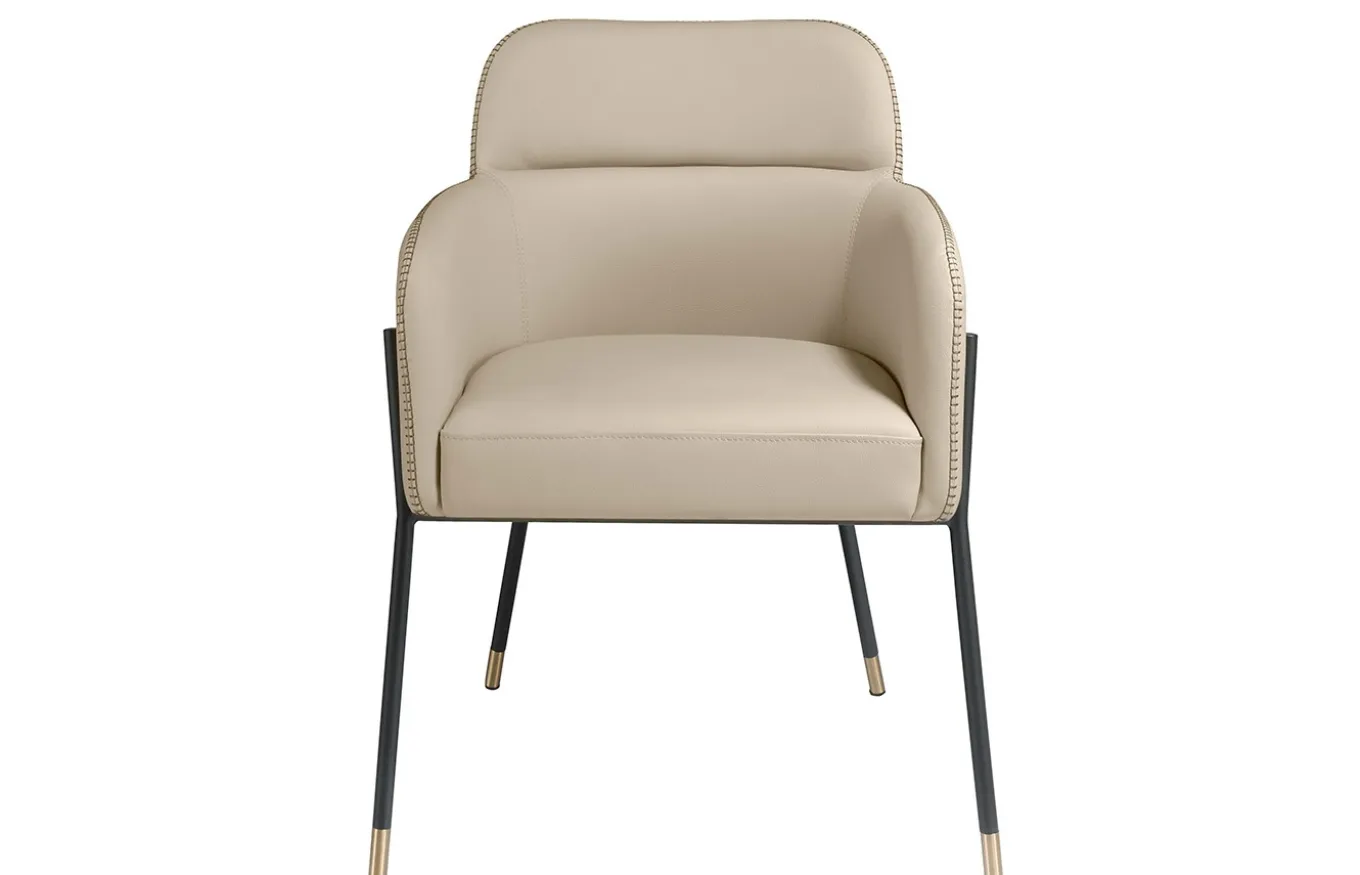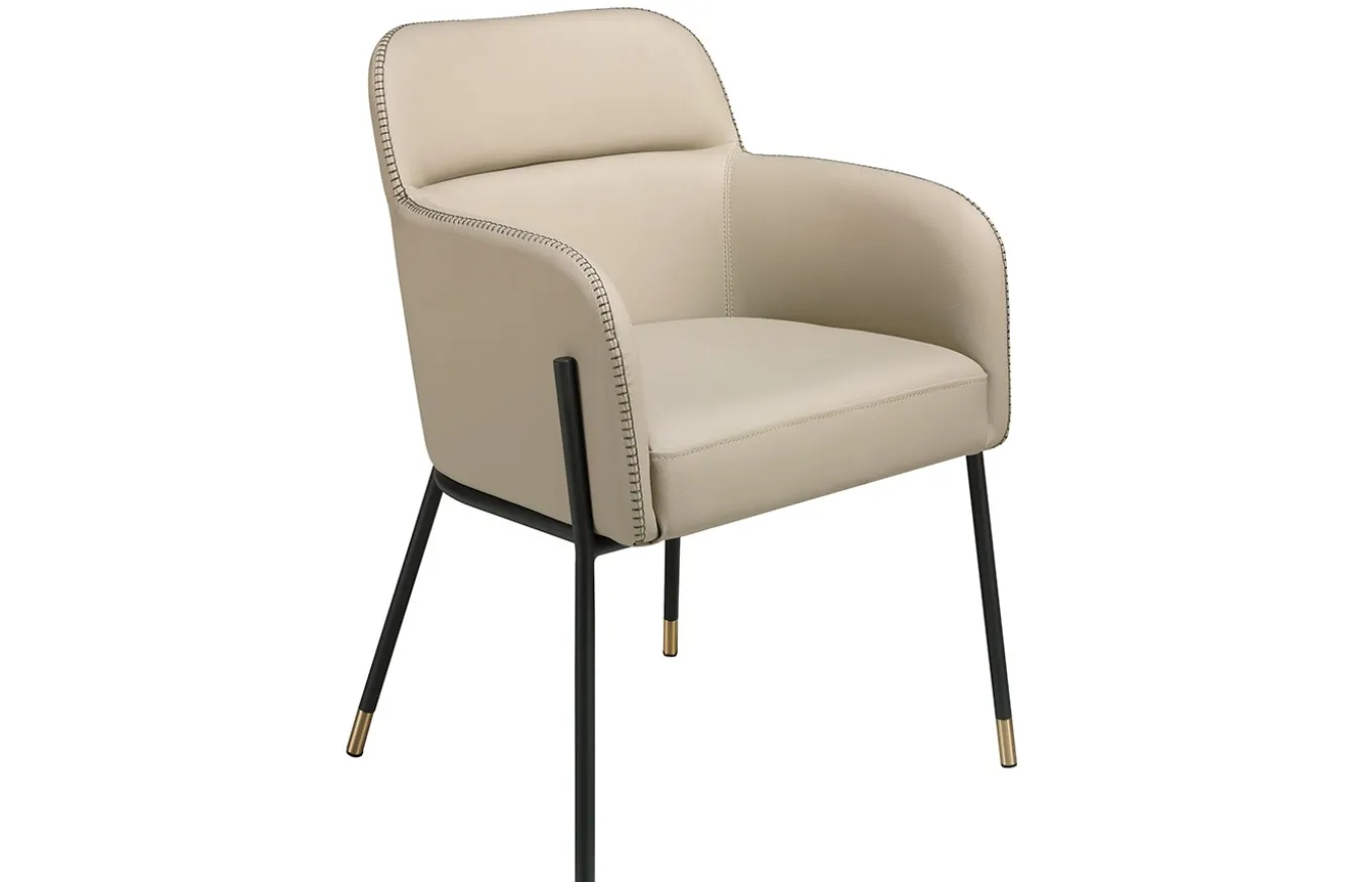 Silla comedor de diseño moderno tapizada en polipiel color visón. Una silla de estilo actual y atemporal con estructura de patas de acero epoxi color negro y detalle en acero dorado, que se convertirá en el must have de tu comedor. Su respaldo y asiento de espuma de poliuretano de 25kg/m3 y diseño envolvente le aporta ese estilo único y diferente que buscas para tu hogar, combinándolo con la mayor comodidad.