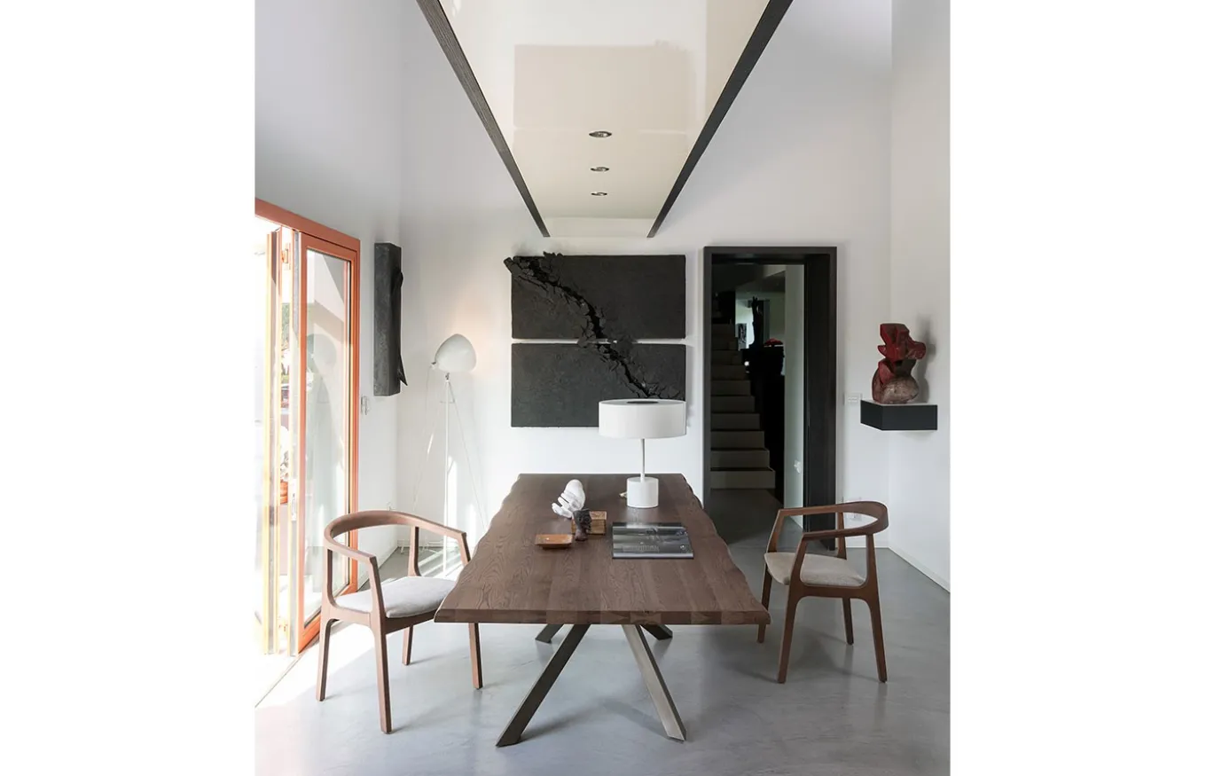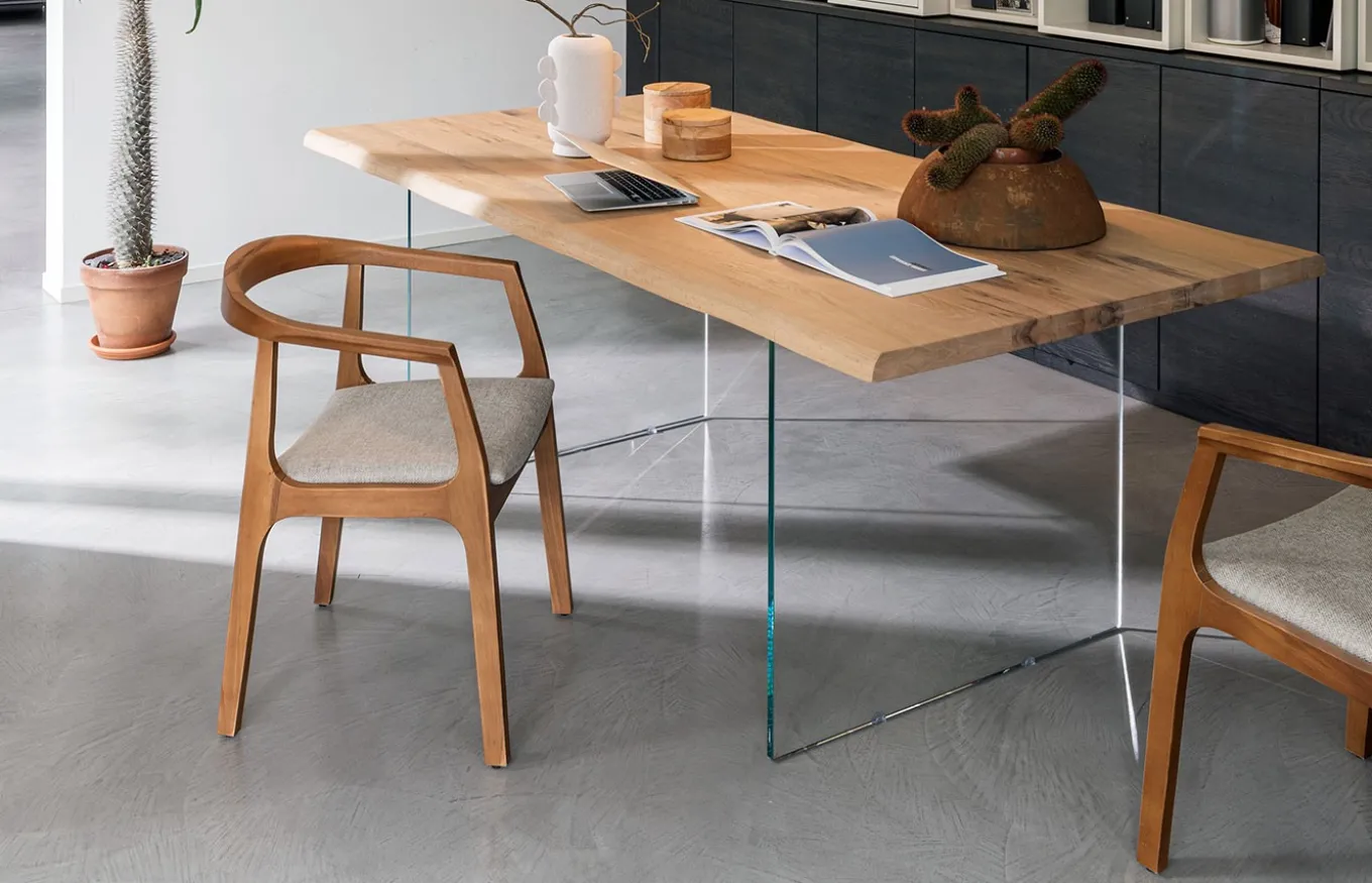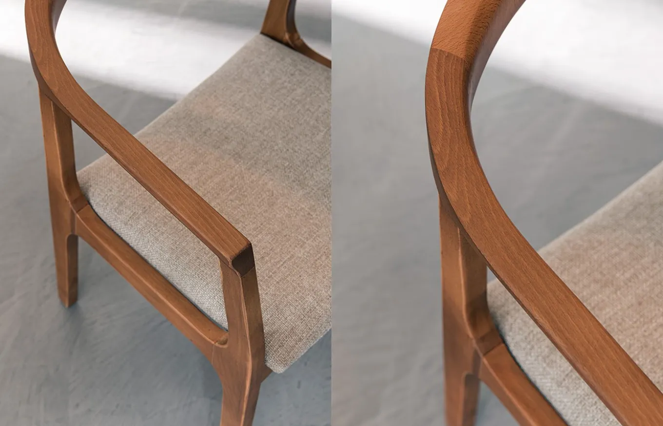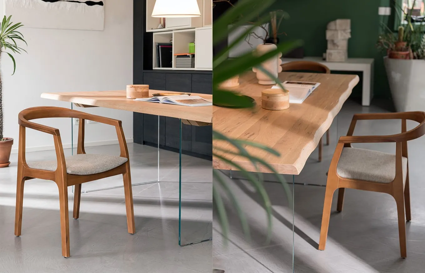 Sillón Noa de comedor de estilo moderno. El diseño de Rivanova es muy funcional, fácil de interpretar, pero al mismo tiempo rico en detalles dados por los materiales utilizados: madera natural, cristal y hierro. Rivanova selecciona la madera por su singularidad, realzada por imperfecciones naturales que son consideradas parte integrante del resultado final que se quiere conseguir.
