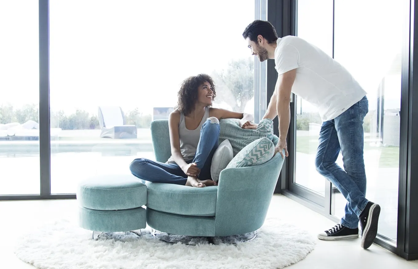 El sillón Roxane es un sillón con un diseño muy especial que te hará disfrutar de momentos inolvidables. Su respaldo curvo crea un ambiente de tranquilidad que nos permite evadirnos de todo disfrutar de los momentos de relax. La base giratoria y el puff le aportan una gran comodidad. La forma del puff nos permite adaptarlo al sillón tanto frontal como lateralmente, aportando una comodidad increíble en todas las posiciones. El sillón tiene base giratoria, mientras que el puff tiene 4 patas metálicas.