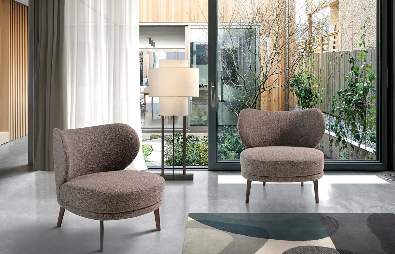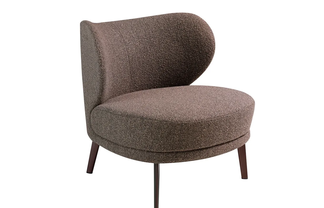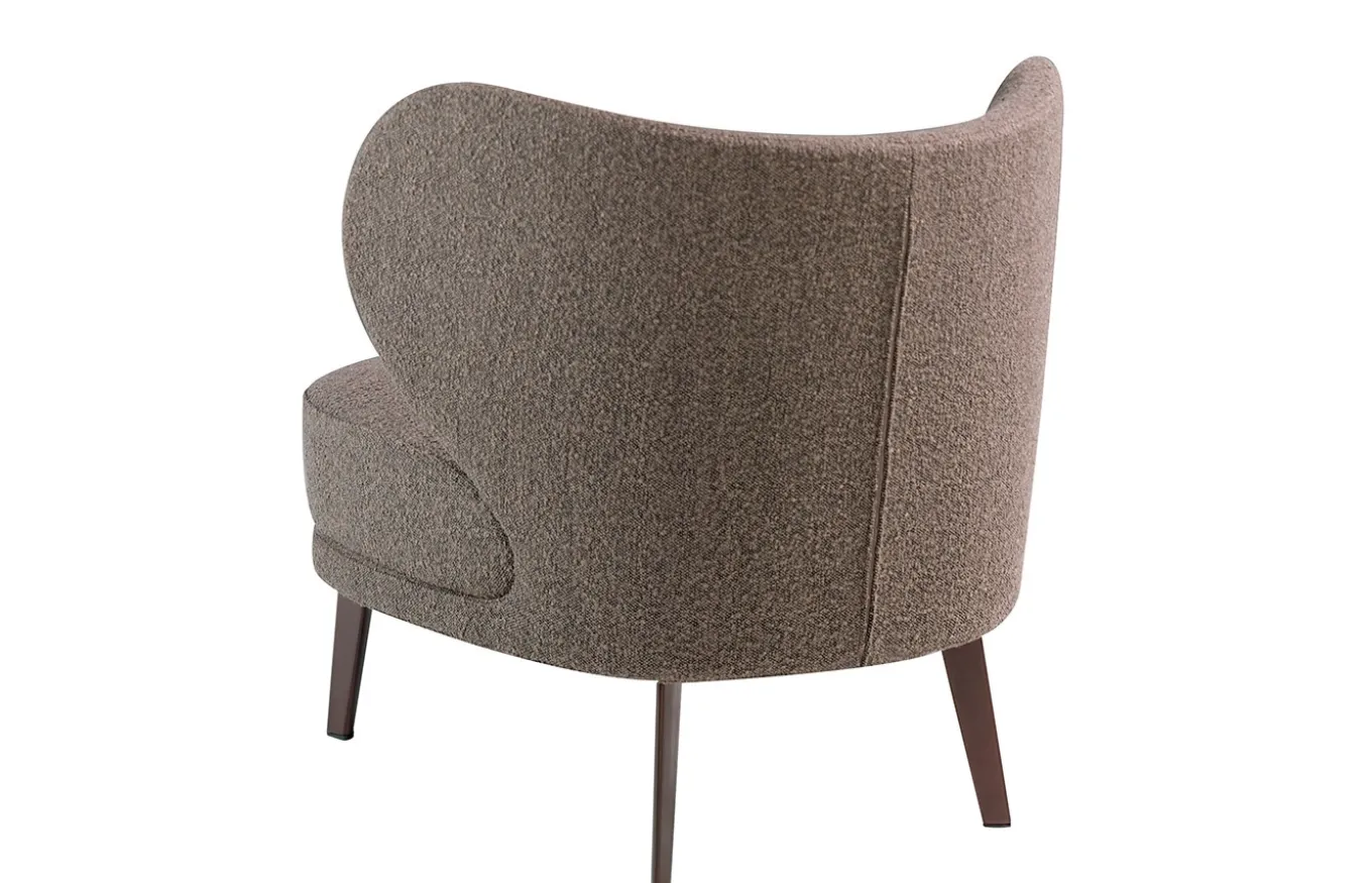 Sillón de diseño moderno con un original tapizado en tela color marrón con relieve en su textura. Un sillón de tendencia perfecto para tu zona de descanso y relax, con respaldo y asiento relleno de espuma de poliuretano de 25kg/m3 de densidad. Su estructura de patas en acero pintado en epoxi color marrón, aportará ese toque de vanguardia y elegancia que buscas para tu hogar. La combinación perfecta entre diseño y confort.