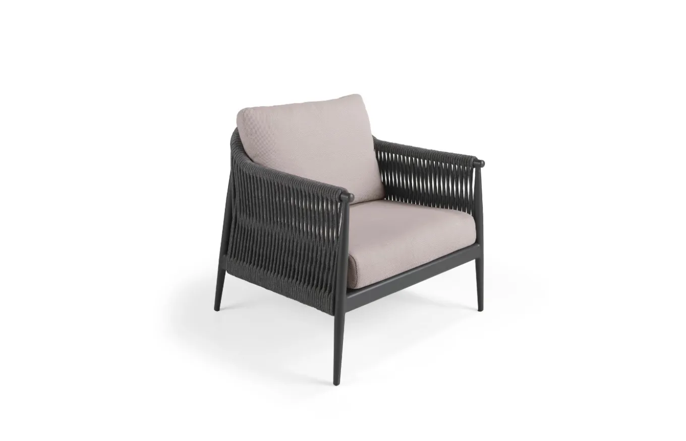 El sillón Termoli de Agua de Mar es una pieza de mobiliario elegante, ideal para espacios exteriores. Está fabricado con una estructura de aluminio resistente en color carbón que se complementa a la perfección con la cuerda redonda del mismo color, formando los brazos y el respaldo.